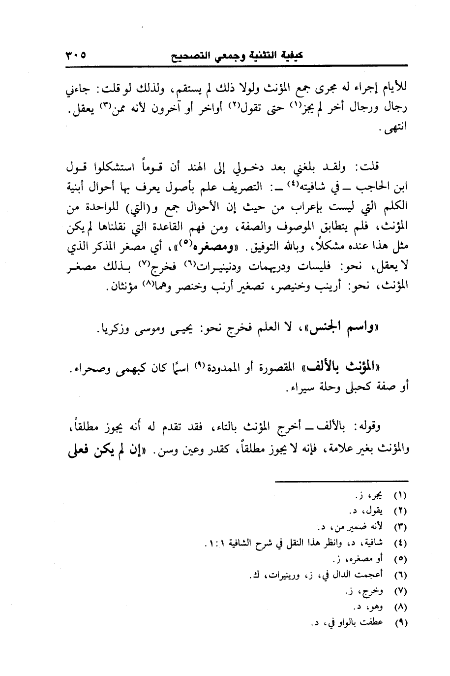 قلت: ولقد بلغني بعد دخولي إلى الهند أن قوما استشكلوا قول الحاجب – في شافيته -: التصريف على بأصول يعرف بها أحوال أبنية الكلم التي ليست بإعراب من حيث إن الأحوال جمع و (التي) للواحدة من المؤنث، فلم يتطابق الموصوف والصفة، ومن فهم القاعدة التي نقلناها لم يكن مثل هذا عنده مشكلا، وبالله التوفيق "ومصغرة"، أي مصغر المذكر الذي لا يعقل، نحو: فليسات ودريهمات ودنينيرات فخرج بذلك مصغر المؤنث، نحو: أرينب وخنيصر، تصغير أرنب وخنيصر وهما مؤنثان.