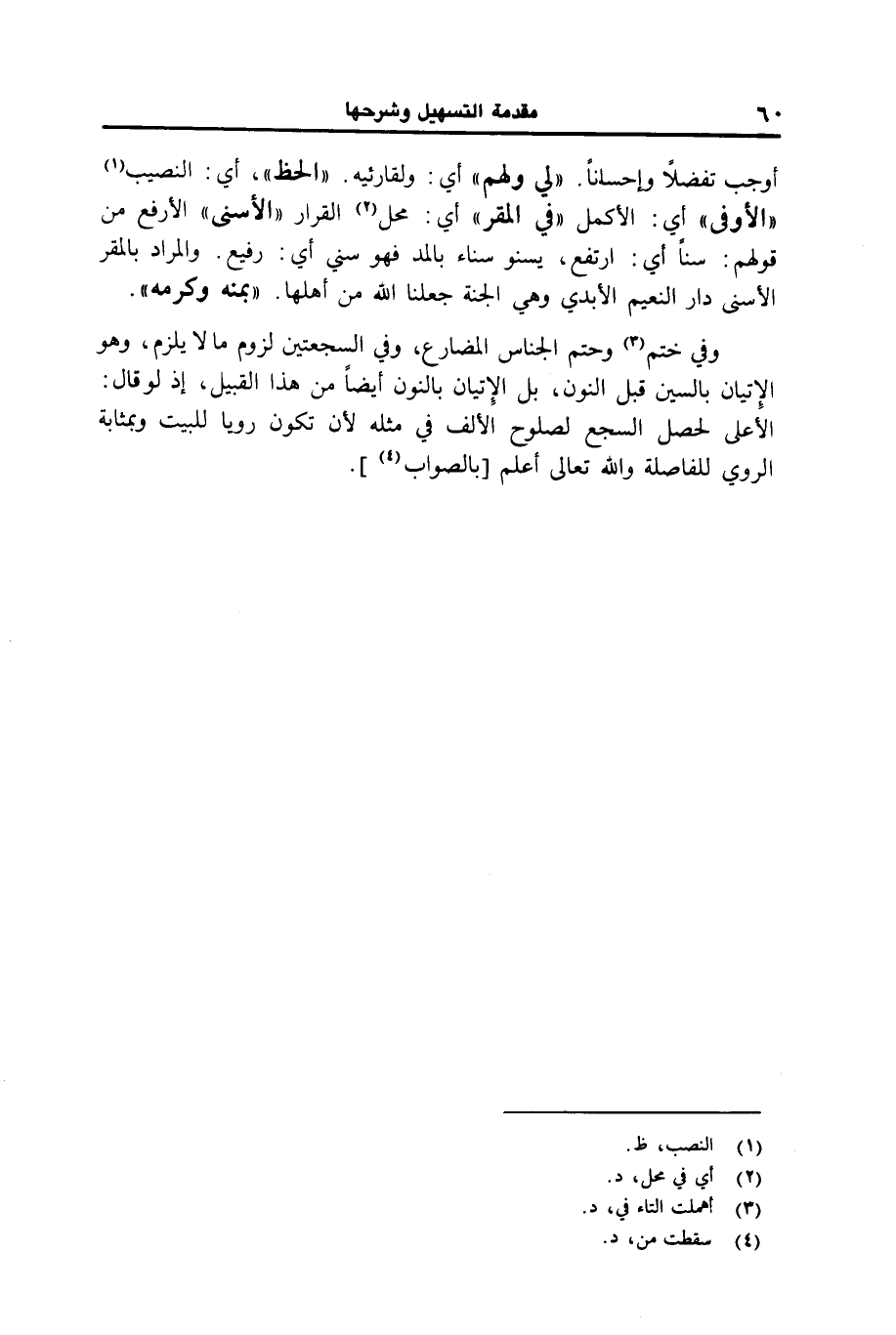 أوجب تفضلا وإحسانا. "لي ولهم" أي: ولقارئيه. "الحظ"، أي: النصيب "الأوفى" أي: الأكمل "في المقر" أي: محل القرار "الأسنى" الأرفع من قولهم سنا أي: ارتفع، يسنو سناء بالمد فهو سني أي: رفيع. والمراد بالمقر الأسنى دار النعيم الأبدي وهي الجنة جعلنا الله من أهلها. "بمنه وكرمه".