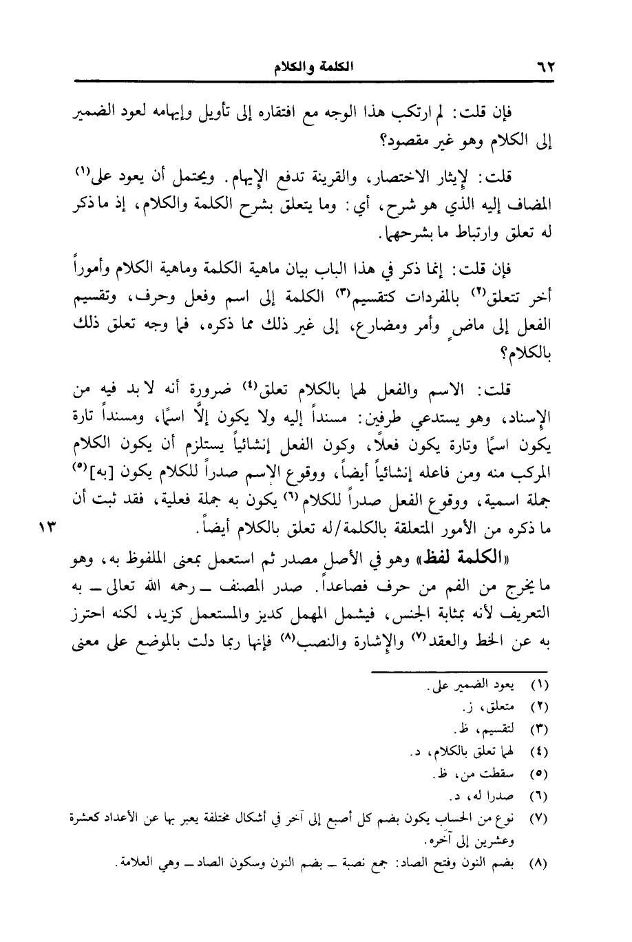 قلت: لإيثار الاختصار، والقرينة تدفع الإيهام. ويحتمل أن يعود على المضاف إليه الذي هو شرح، أي: وما يتعلق بشرح الكلمة والكلام، إذ ما ذكر له تعلق وارتباط ما بشرحهما.