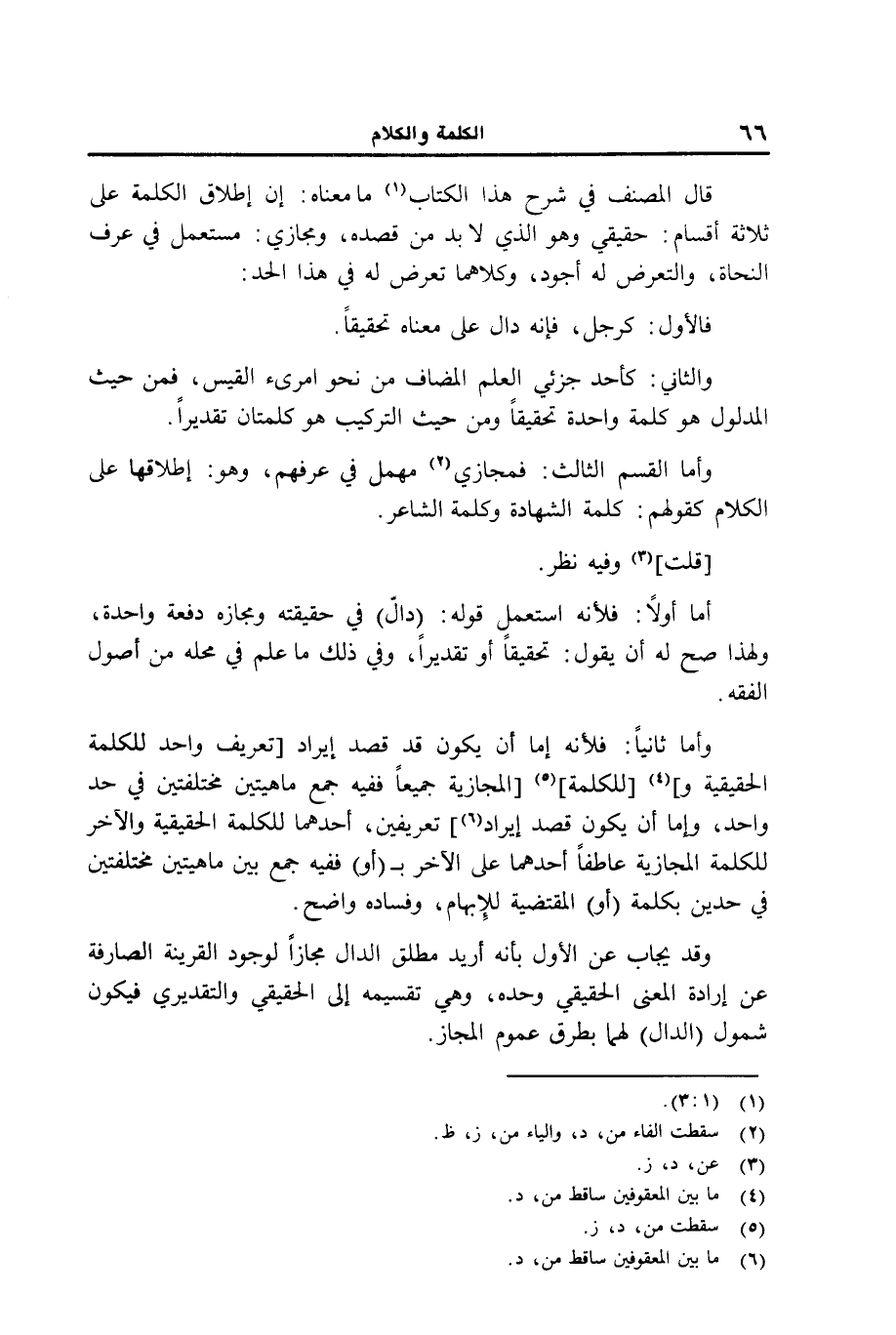 قال المصنف في شرح هذا الكتاب ما معناه: إن إطلاق الكلمة على ثلاثة أقسام: حقيقي وهو الذي لابد من قصده، ومجازي: مستعمل في عرف النحاة، والتعرض له أجود، وكلاهما تعرض له في هذا الحد: