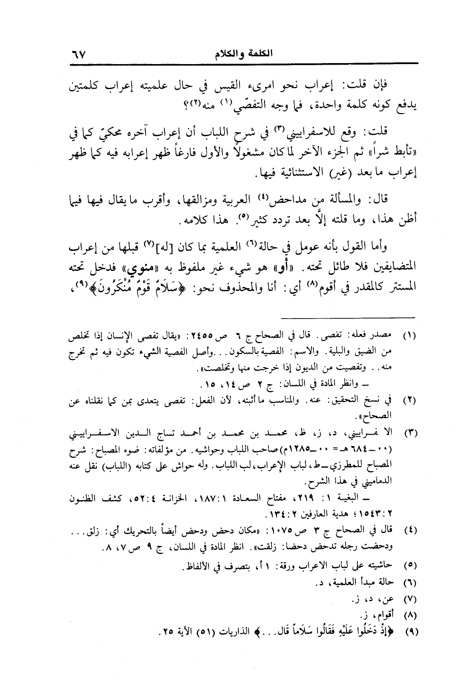 قال: والمسألة من مداحض العربية ومزالقها، وأقرب ما يقال فيها فيما أظن هذا، وما قلته إلا بعد تردد كثير. هذا كلامه.