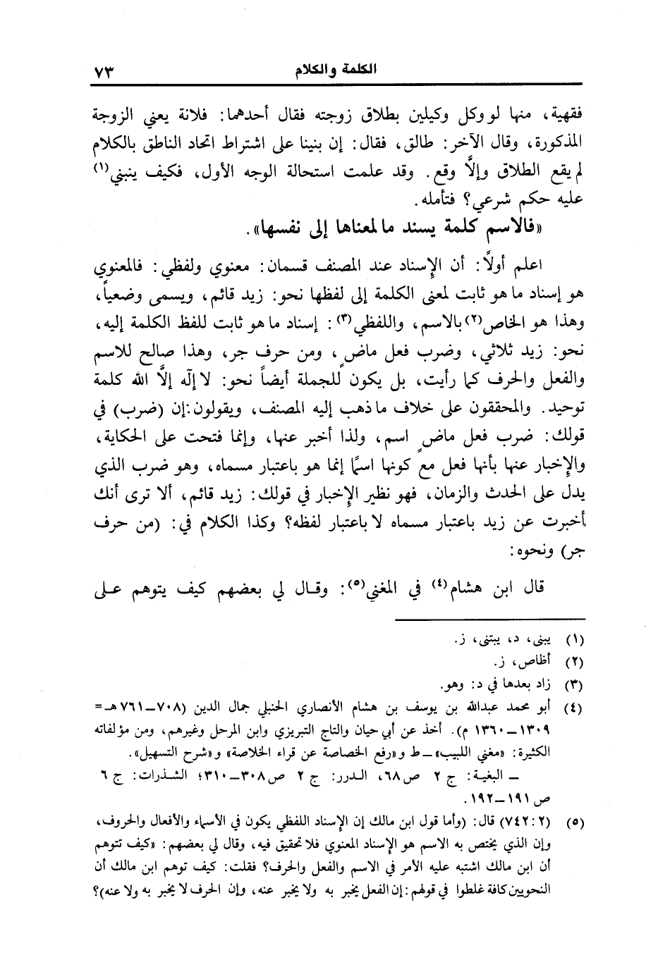 فقهية، منها لو وكل وكيلين بطلاق زوجته فقال أحدهما: فلانة يعني الزوجة، المذكورة وقال الآخر: طالق، فقال: إن بنينا على اشتراط اتحاد الناطق بالكلام لم يقع الطلاق وإلا وقع.