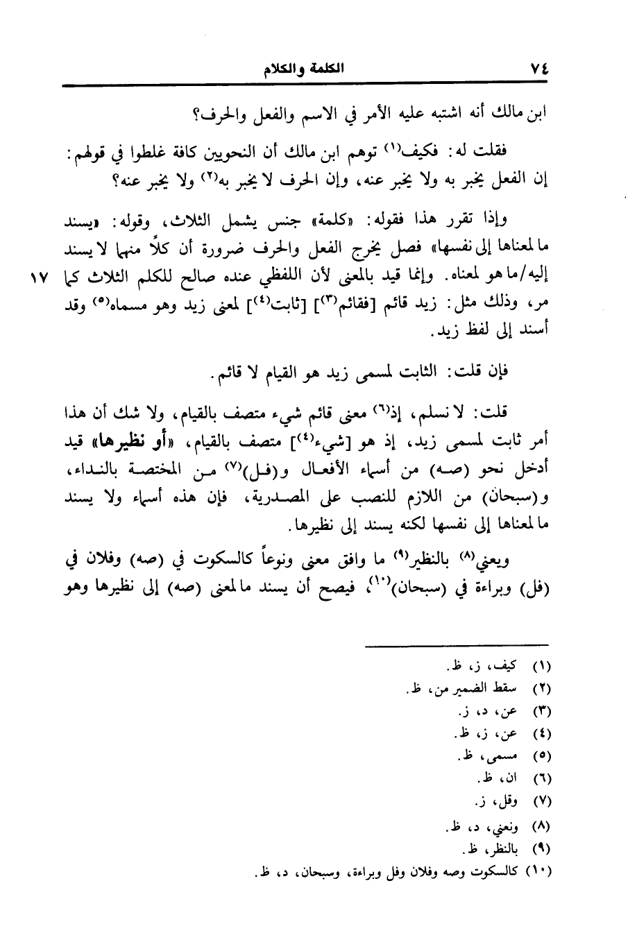 فقلت له: كيف توهم ابن مالك أن النحويين كافة غلطوا في قولهم: إن الفعل يخبر به ولا يخبر عنه؟ وإذا تقرر هذا فقوله: "كلمة" جنس يشمل الثلاث، وقوله: "يسند ما لمعناها إلى نفسها" فصل يخرج الفعل والحرف ضرورة أن كل منهما لا يسند إليه/ ما هو لمعناه.