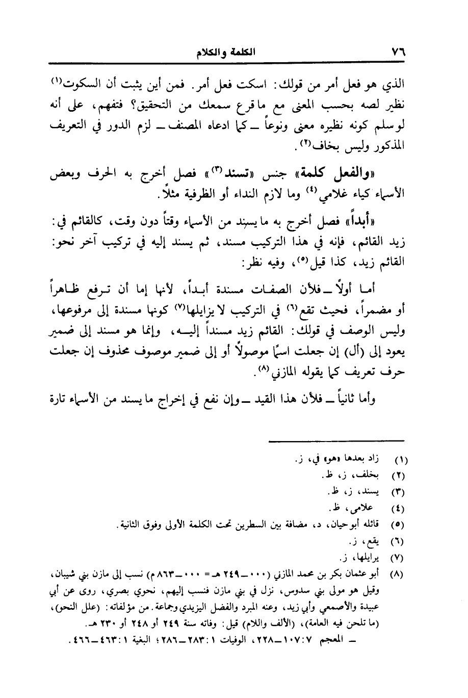 أما أولا- فلأن الصفات مسندة أبدا، لأنها إما أن ترفع ظاهرا أو مضمرا، فحيث تقع في التركيب لا يزايلها كونها مسندة إلى مرفوعها، وليس الوصف في قولك: القائم زيد مسندا ليه، وإنما هو مسند إلى ضمير يعول إلى (أل) إن جعلت اسما موصولا أو ضمير موصوف محذوف إن جعلت حرف تعريف كما يقوله المازني.