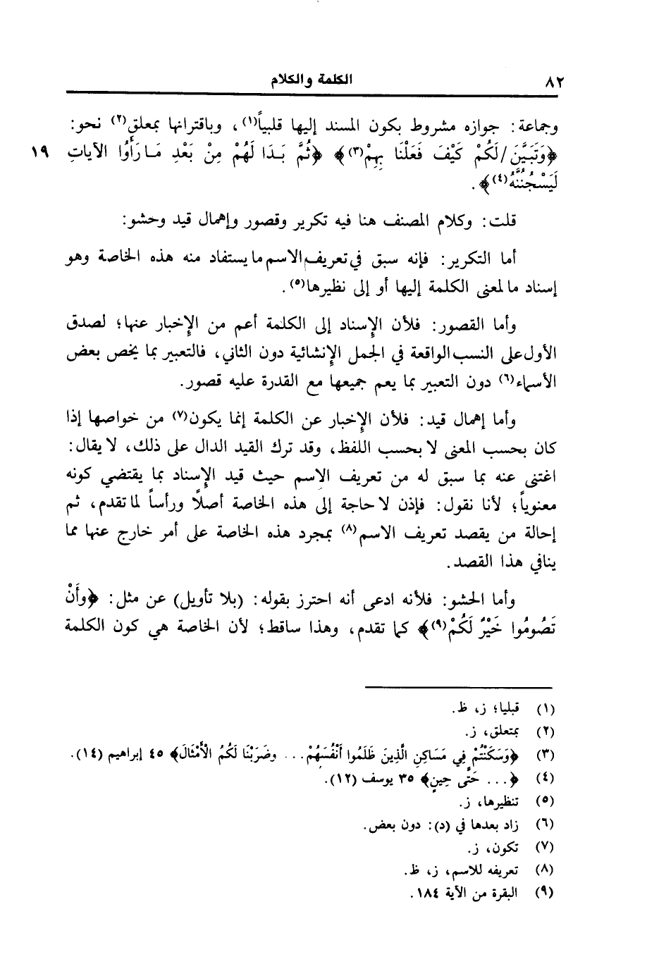 وأما القصور: فلأن الإسناد إلى الكلمة أعم من الإخبار عنها؛ لصدق الأول على النسب الواقعة في الجمل الإنشائية دون الثاني، فالتعبير بما يخص بعض الأسماء دون التعبير بما يعم جميعها مع القدرة عليه قصور.