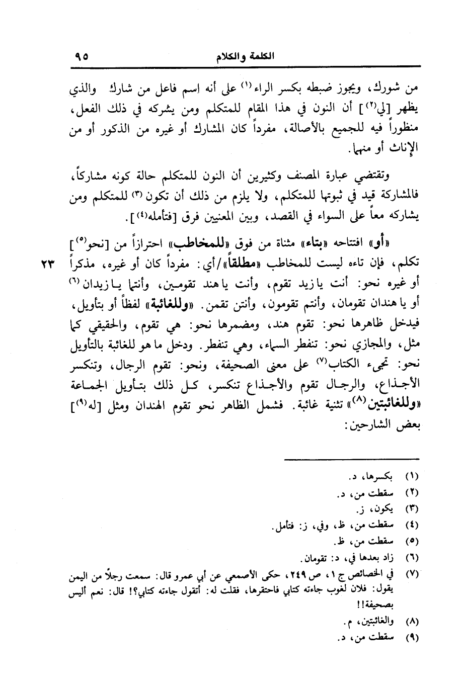 وتقتضي عبارة المصنف وكثيرون أن النون للمتكلم حالة كونه مشاركا، فالمشاركة قيد في ثبوتها للمتكلم، ولا يلزم من ذلك أن تكون للمتكلم ومن يشاركه معا على السواء في القصد، وبين المعنيين فرق [فتأمله].