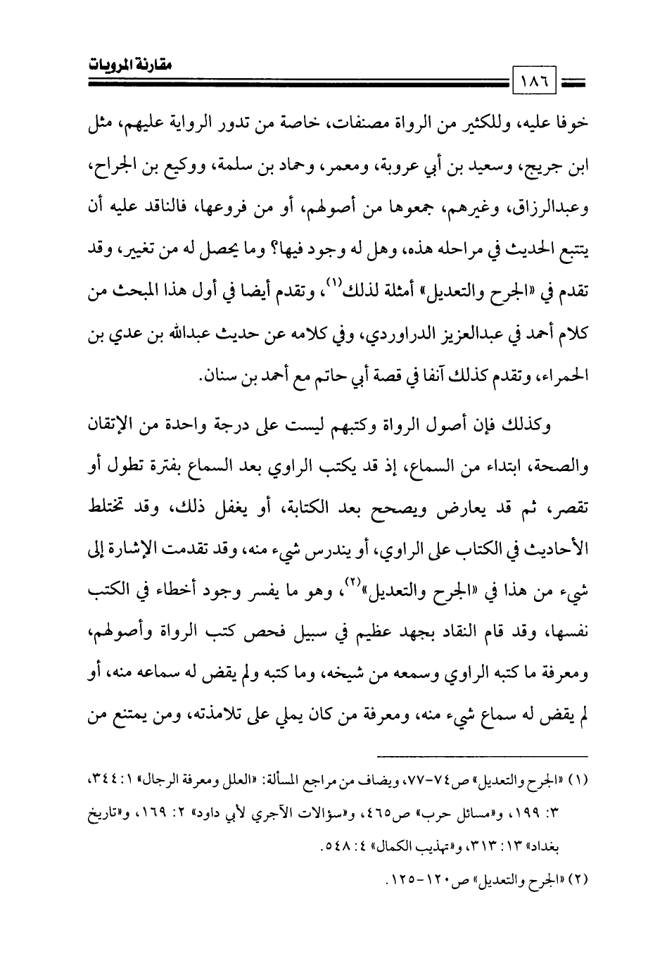 خوفا عليه، وللكثير من الرواة مصنفات، خاصة من تدور الرواية عليهم، مثل ابن جريج، وسعيد بن أبي عروبة، ومعمر، وحماد بن سلمة، ووكيع بن الجراح، وعبدالرزاق، وغيرهم، جمعوها من أصولهم، أو من فروعها، فالناقد عليه أن يتتبع الحديث في مراحله هذه، وهل له وجود فيها؟ وما يحصل له من تغيير، وقد تقدم في «الجرح والتعديل» أمثلة لذلك (¬١)، وتقدم أيضا في أول هذا المبحث من كلام أحمد في عبدالعزيز الدراوردي، وفي كلامه عن حديث عبدالله بن عدي بن الحمراء، وتقدم كذلك آنفا في قصة أبي حاتم مع أحمد بن سنان.