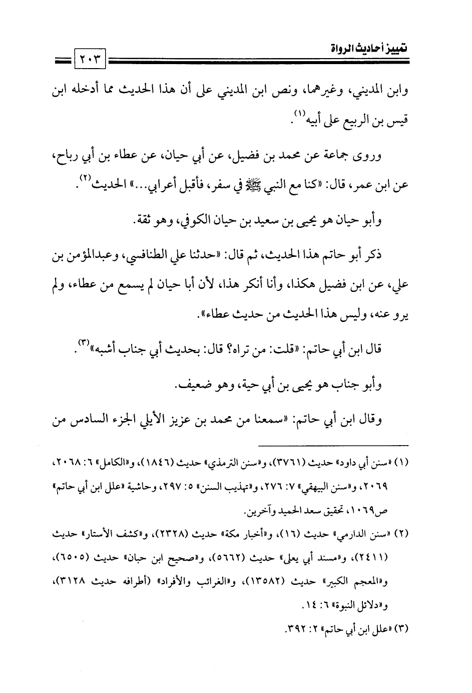 وروى جماعة عن محمد بن فضيل، عن أبي حيان، عن عطاء بن أبي رباح، عن ابن عمر، قال: «كنا مع النبي - صلى الله عليه وسلم - في سفر، فأقبل أعرابي ... » الحديث (¬٢).