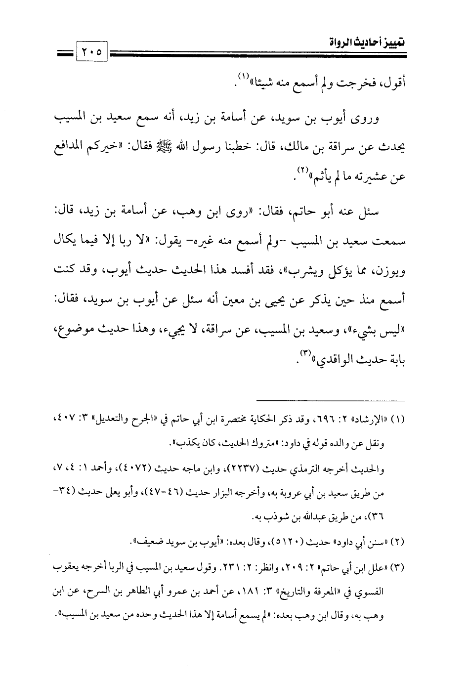 سئل عنه أبو حاتم، فقال: «روى ابن وهب، عن أسامة بن زيد، قال: سمعت سعيد بن المسيب -ولم أسمع منه غيره- يقول: «لا ربا إلا فيما يكال ويوزن، مما يؤكل ويشرب»، فقد أفسد هذا الحديث حديث أيوب، وقد كنت أسمع منذ حين يذكر عن يحيى بن معين أنه سئل عن أيوب بن سويد، فقال: «ليس بشيء»، وسعيد بن المسيب، عن سراقة، لا يجيء، وهذا حديث موضوع، بابة حديث الواقدي» (¬٣).