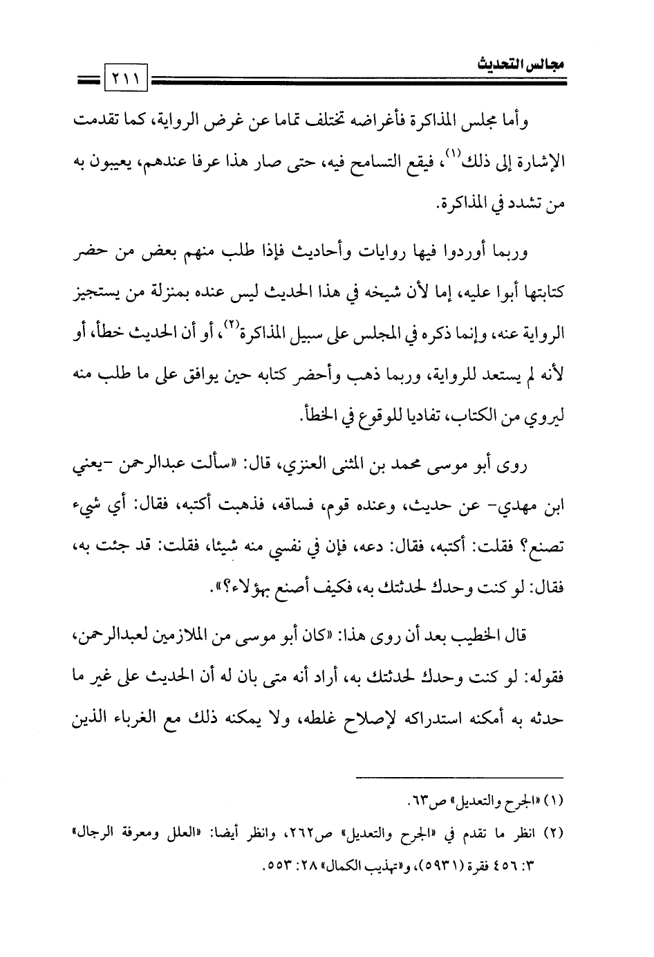 وأما مجلس المذاكرة فأغراضه تختلف تماما عن غرض الرواية، كما تقدمت الإشارة إلى ذلك (¬١)، فيقع التسامح فيه، حتى صار هذا عرفا عندهم، يعيبون به من تشدد في المذاكرة.
