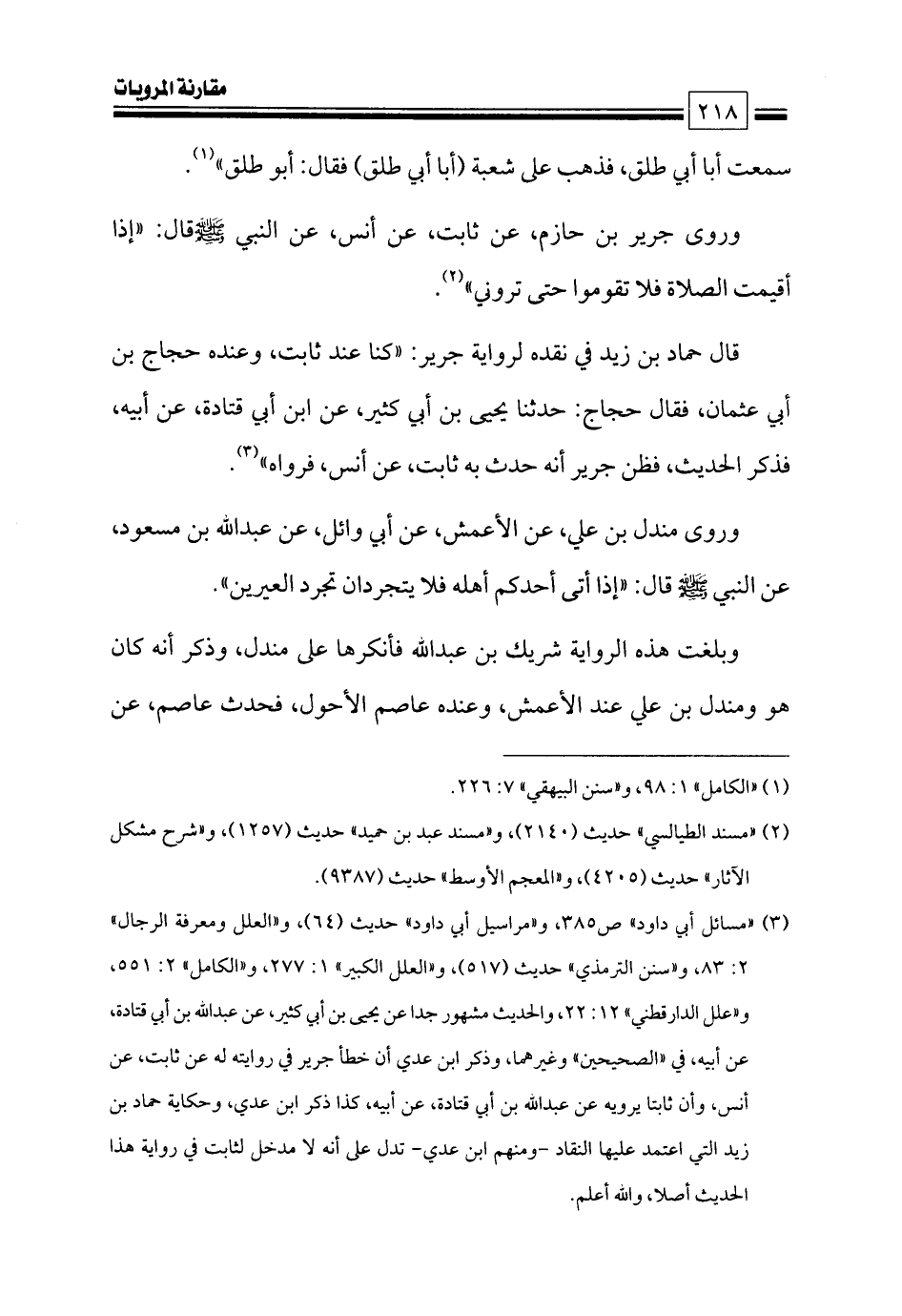 (¬٣) «مسائل أبي داود» ص ٣٨٥، و «مراسيل أبي داود» حديث (٦٤)، و «العلل ومعرفة الرجال» ٢: ٨٣، و «سنن الترمذي» حديث (٥١٧)، و «العلل الكبير» ١: ٢٧٧، و «الكامل» ٢: ٥٥١، و «علل الدارقطني» ١٢: ٢٢، والحديث مشهور جدا عن يحيى بن أبي كثير، عن عبدالله بن أبي قتادة، عن أبيه، في «الصحيحين» وغيرهما، وذكر ابن عدي أن خطأ جرير في روايته له عن ثابت، عن أنس، وأن ثابتا يرويه عن عبدالله بن أبي قتادة، عن أبيه، كذا ذكر ابن عدي، وحكاية حماد بن زيد التي اعتمد عليها النقاد -ومنهم ابن عدي- تدل على أنه لا مدخل لثابت في رواية هذا الحديث أصلا، والله أعلم.