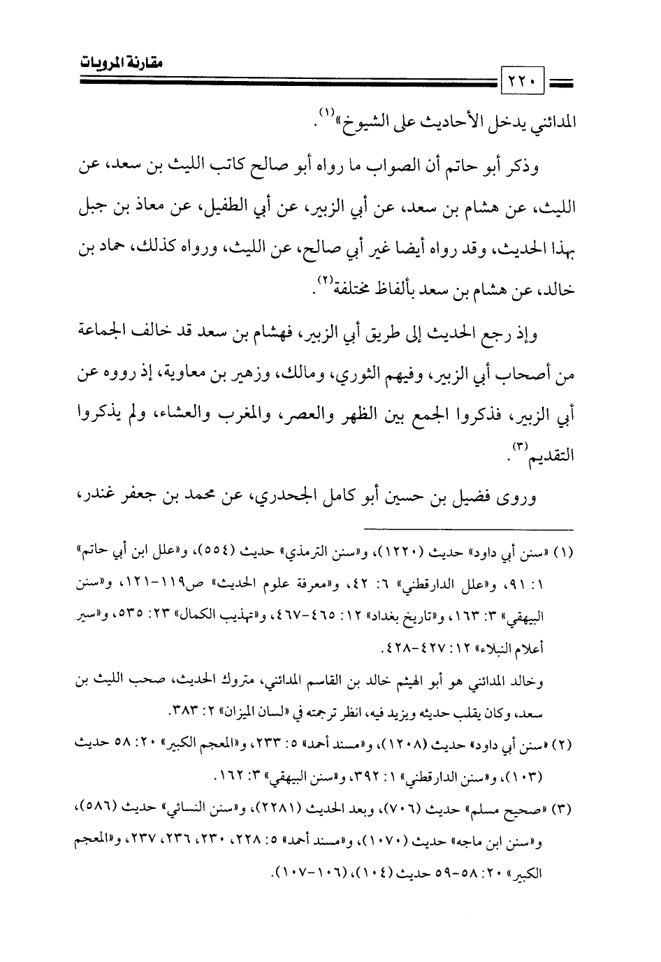 وإذ رجع الحديث إلى طريق أبي الزبير، فهشام بن سعد قد خالف الجماعة من أصحاب أبي الزبير، وفيهم الثوري، ومالك، وزهير بن معاوية، إذ رووه عن أبي الزبير، فذكروا الجمع بين الظهر والعصر، والمغرب والعشاء، ولم يذكروا التقديم (¬٣).