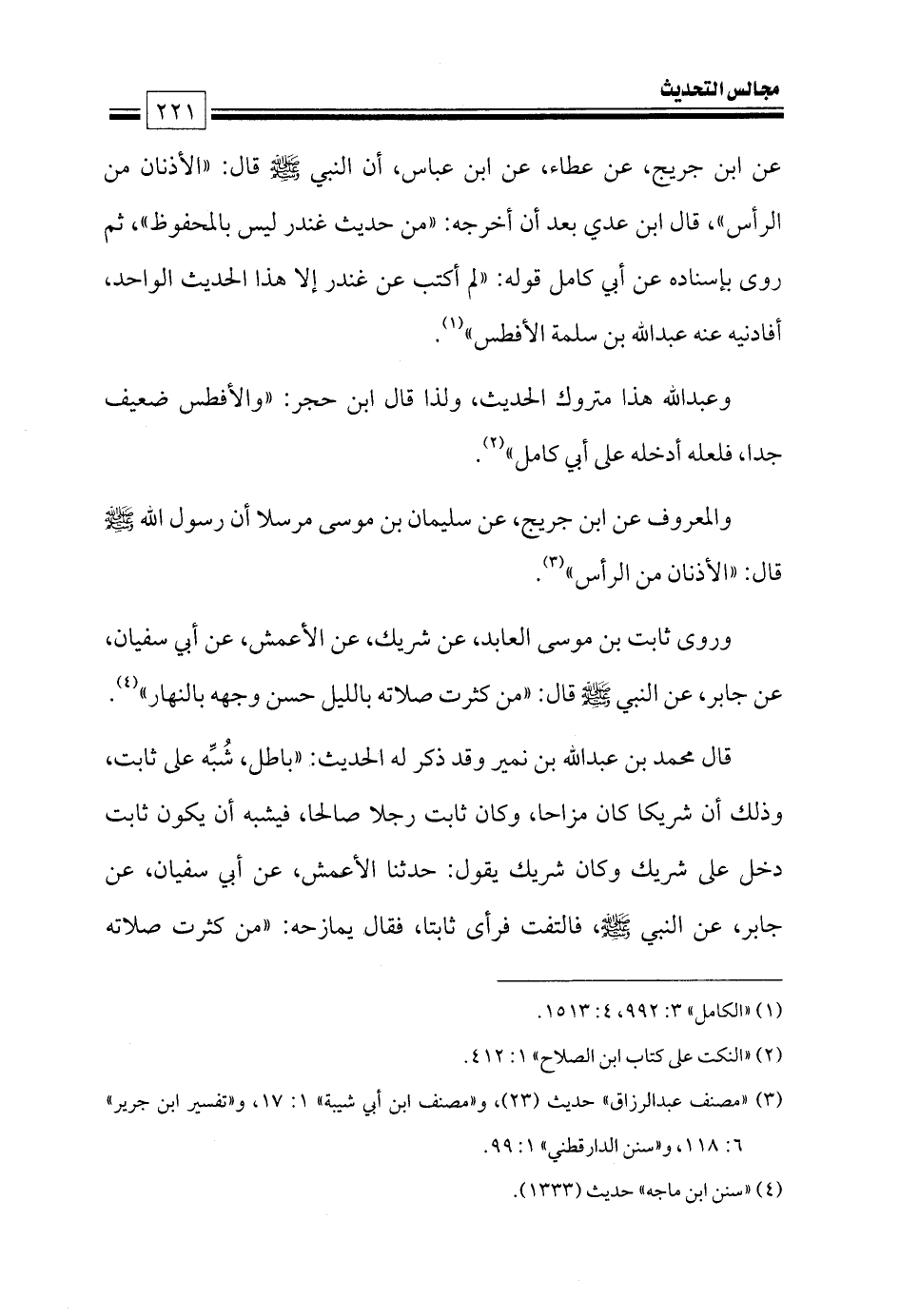 عن ابن جريج، عن عطاء، عن ابن عباس، أن النبي - صلى الله عليه وسلم - قال: «الأذنان من الرأس»، قال ابن عدي بعد أن أخرجه: «من حديث غندر ليس بالمحفوظ»، ثم روى بإسناده عن أبي كامل قوله: «لم أكتب عن غندر إلا هذا الحديث الواحد، أفادنيه عنه عبدالله بن سلمة الأفطس» (¬١).