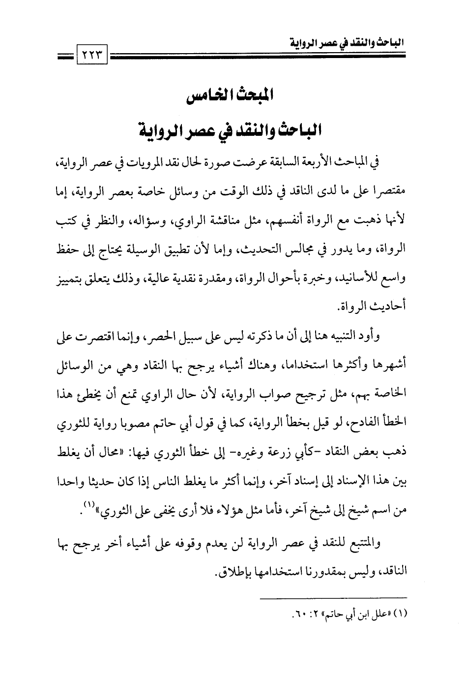 في المباحث الأربعة السابقة عرضت صورة لحال نقد المرويات في عصر الرواية، مقتصرا على ما لدى الناقد في ذلك الوقت من وسائل خاصة بعصر الرواية، إما لأنها ذهبت مع الرواة أنفسهم، مثل مناقشة الراوي، وسؤاله، والنظر في كتب الرواة، وما يدور في مجالس التحديث، وإما لأن تطبيق الوسيلة يحتاج إلى حفظ واسع للأسانيد، وخبرة بأحوال الرواة، ومقدرة نقدية عالية، وذلك يتعلق بتمييز أحاديث الرواة.