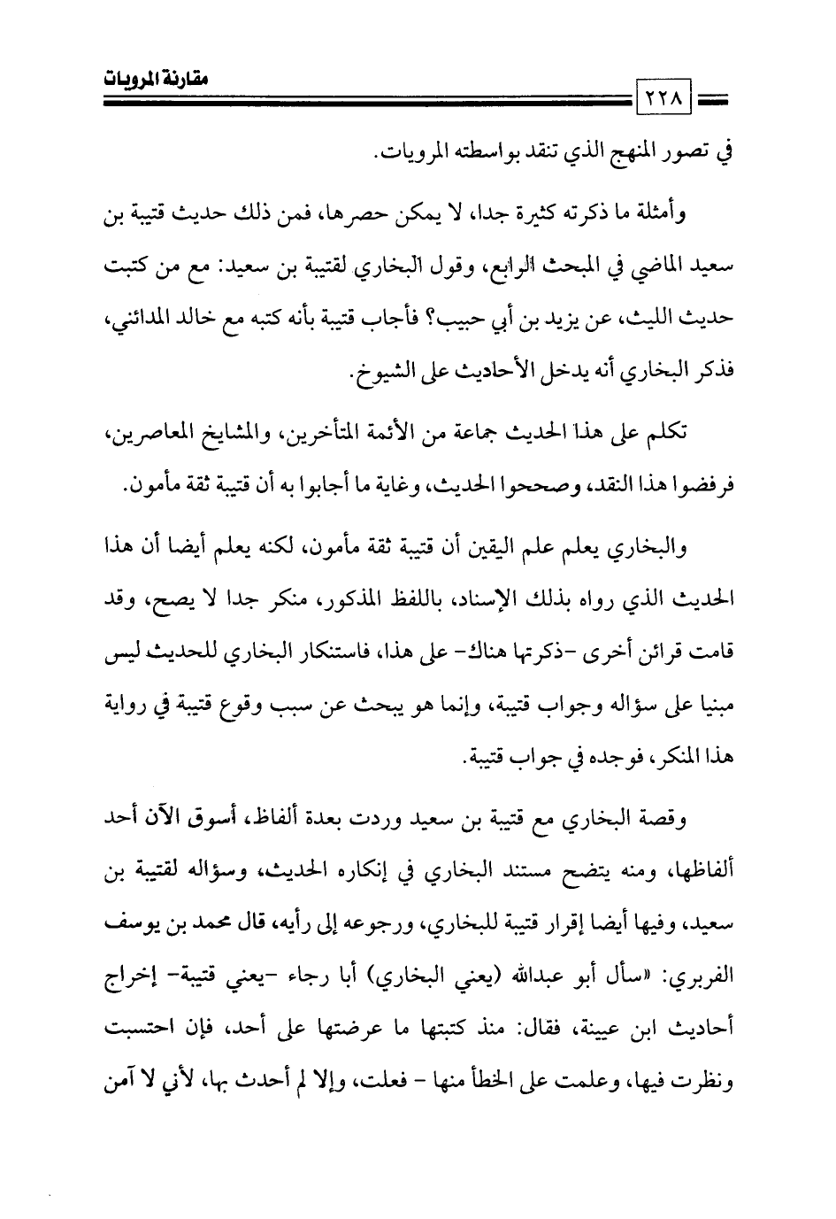 وقصة البخاري مع قتيبة بن سعيد وردت بعدة ألفاظ، أسوق الآن أحد ألفاظها، ومنه يتضح مستند البخاري في إنكاره الحديث، وسؤاله لقتيبة بن سعيد، وفيها أيضا إقرار قتيبة للبخاري، ورجوعه إلى رأيه، قال محمد بن يوسف الفربري: «سأل أبو عبدالله (يعني البخاري) أبا رجاء -يعني قتيبة- إخراج أحاديث ابن عيينة، فقال: منذ كتبتها ما عرضتها على أحد، فإن احتسبت ونظرت فيها، وعلمت على الخطأ منها - فعلت، وإلا لم أحدث بها، لأني لا آمن