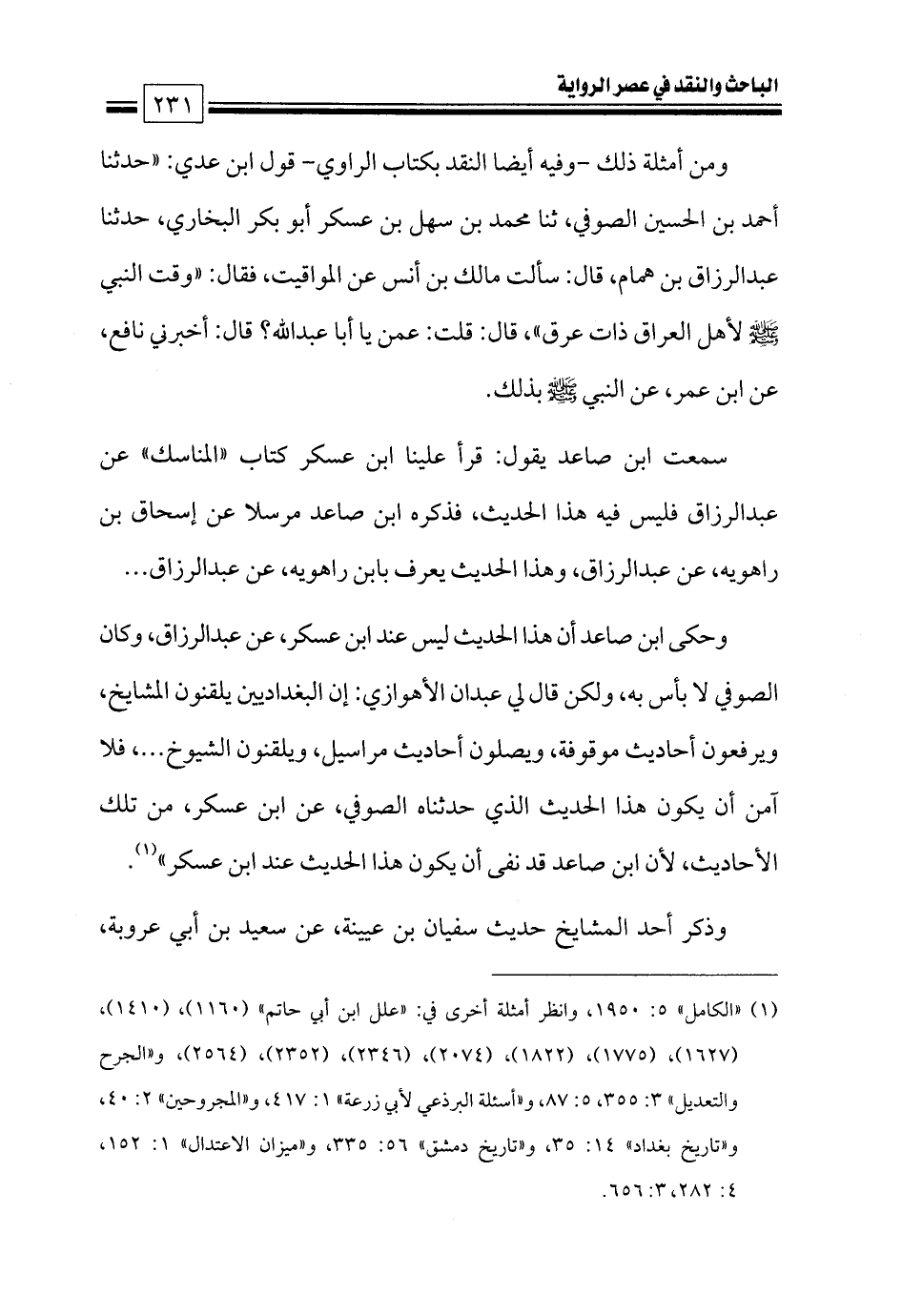 (¬١) «الكامل» ٥: ١٩٥٠، وانظر أمثلة أخرى في: «علل ابن أبي حاتم» (١١٦٠)، (١٤١٠)، (١٦٢٧)، (١٧٧٥)، (١٨٢٢)، (٢٠٧٤)، (٢٣٤٦)، (٢٣٥٢)، (٢٥٦٤) , و «الجرح والتعديل» ٣: ٣٥٥، ٥: ٨٧، و «أسئلة البرذعي لأبي زرعة» ١: ٤١٧، و «المجروحين» ٢: ٤٠، و «تاريخ بغداد» ١٤: ٣٥، و «تاريخ دمشق» ٥٦: ٣٣٥، و «ميزان الاعتدال» ١: ١٥٢، ٤: ٢٨٢، ٣: ٦٥٦.