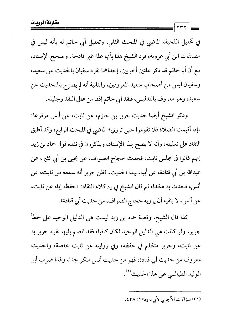 وذكر الشيخ أيضا حديث جرير بن حازم، عن ثابت، عن أنس مرفوعا: «إذا أقيمت الصلاة فلا تقوموا حتى تروني» الماضي في المبحث الرابع، وقد أطبق النقاد على تعليله، وأنه لا يصح بهذا الإسناد، ويذكرون في نقده قول حماد بن زيد إنهم كانوا في مجلس ثابت، فحدث حجاج الصواف، عن يحيى بن أبي كثير، عن عبدالله بن أبي قتادة، عن أبيه، بهذا الحديث، فظن جرير أنه سمعه من ثابت، عن أنس، فحدث به هكذا، ثم قال الشيخ في رد كلام النقاد: «حفظه إياه عن ثابت، عن أنس، لا ينفيه أن يرويه حجاج الصواف، من حديث أبي قتادة».