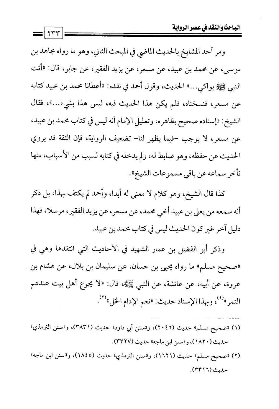 ومر أحد المشايخ بالحديث الماضي في المبحث الثاني، وهو ما رواه مجاهد بن موسى، عن محمد بن عبيد، عن مسعر، عن يزيد الفقير، عن جابر، قال: «أتت النبي - صلى الله عليه وسلم - بواكي ... » الحديث، وقول أحمد في نقده: «أعطانا محمد بن عبيد كتابه عن مسعر، فنسخناه، فلم يكن هذا الحديث فيه، ليس هذا بشيء ... »، فقال الشيخ: «إسناده صحيح بظاهره، وتعليل الإمام أنه ليس في كتاب محمد بن عبيد، عن مسعر، لا يوجب -فيما يظهر لنا- تضعيف الرواية، فإن الثقة قد يروي الحديث عن حفظه، وهو ضابط له، ولم يدخله في كتابه لسبب من الأسباب، منها تأخر سماعه عن باقي مسموعات الشيخ».