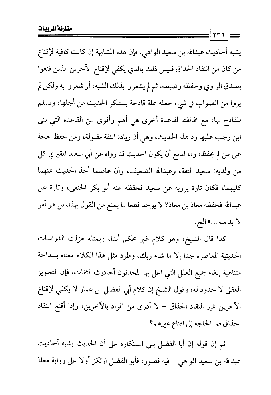 يشبه أحاديث عبدالله بن سعيد الواهي، فإن هذه المشابهة إن كانت كافية لإقناع من كان من النقاد الحذاق فليس ذلك بالذي يكفي لإقناع الآخرين الذين قنعوا بصدق الراوي وحفظه وضبطه، ثم لم يشعروا بذلك الشبه، أو شعروا به ولكن لم يروا من الصواب في شيء جعله علة قادحة يستنكر الحديث من أجلها، ويسلم للقادح بها، مع مخالفته لقاعدة أخرى هي أهم وأقوى من القاعدة التي بنى ابن رجب عليها رد هذا الحديث، وهي أن زيادة الثقة مقبولة، ومن حفظ حجة على من لم يحفظ، وما المانع أن يكون الحديث قد رواه عن أبي سعيد المقبري كل من ولديه: سعيد الثقة، وعبدالله الضعيف، وأن عاصما أخذ الحديث عنهما كليهما، فكان تارة يرويه عن سعيد فحفظه عنه أبو بكر الحنفي، وتارة عن عبدالله فحفظه معاذ بن معاذ؟ لا يوجد قطعا ما يمنع من القول بهذا، بل هو أمر لا بد منه ... » الخ.