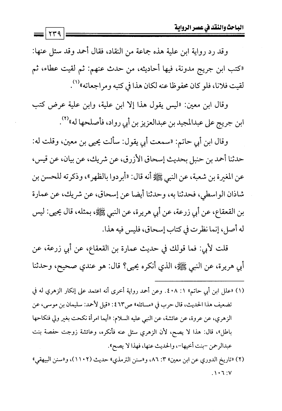 وقد رد رواية ابن علية هذه جماعة من النقاد، فقال أحمد وقد سئل عنها: «كتب ابن جريج مدونة، فيها أحاديثه، من حدث عنهم: ثم لقيت عطاء، ثم لقيت فلانا، فلو كان محفوظا عنه لكان هذا في كتبه ومراجعاته» (¬١).