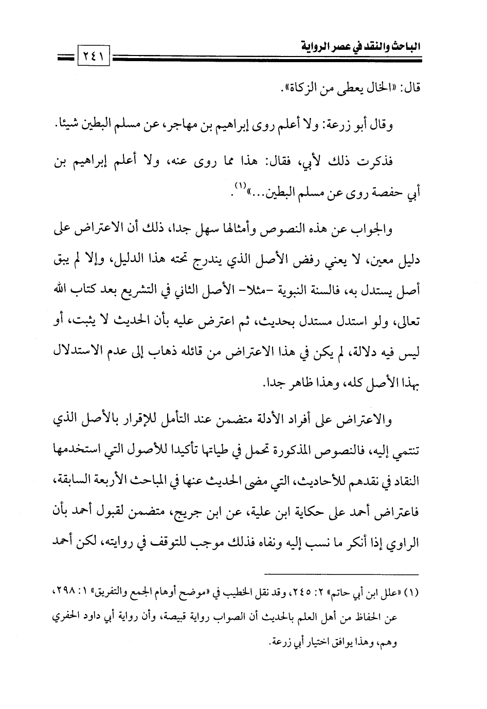 والاعتراض على أفراد الأدلة متضمن عند التأمل للإقرار بالأصل الذي تنتمي إليه، فالنصوص المذكورة تحمل في طياتها تأكيدا للأصول التي استخدمها النقاد في نقدهم للأحاديث، التي مضى الحديث عنها في المباحث الأربعة السابقة، فاعتراض أحمد على حكاية ابن علية، عن ابن جريج، متضمن لقبول أحمد بأن الراوي إذا أنكر ما نسب إليه ونفاه فذلك موجب للتوقف في روايته، لكن أحمد