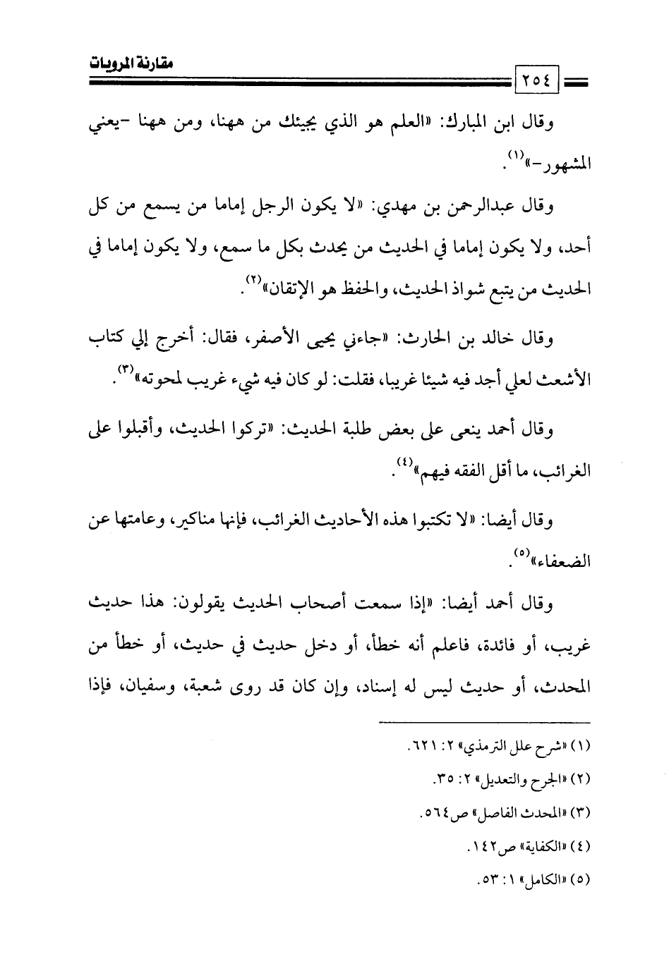 وقال عبدالرحمن بن مهدي: «لا يكون الرجل إماما من يسمع من كل أحد، ولا يكون إماما في الحديث من يحدث بكل ما سمع، ولا يكون إماما في الحديث من يتبع شواذ الحديث، والحفظ هو الإتقان» (¬٢).