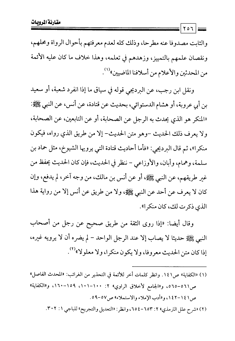 ونقل ابن رجب، عن البرديجي قوله في سياق ما إذا انفرد شعبة، أو سعيد بن أبي عروبة، أو هشام الدستوائي، بحديث عن قتادة، عن أنس، عن النبي - صلى الله عليه وسلم -: «المنكر هو الذي يحدث به الرجل عن الصحابة، أو عن التابعين، عن الصحابة، ولا يعرف ذلك الحديث -وهو متن الحديث- إلا من طريق الذي رواه، فيكون منكرا»، ثم قال البرديجي: «فأما أحاديث قتادة التي يرويها الشيوخ، مثل حماد بن سلمة، وهمام، وأبان، والأوزاعي - ننظر في الحديث، فإن كان الحديث يحفظ من غير طريقهم، عن النبي - صلى الله عليه وسلم -، أو عن أنس بن مالك، من وجه آخر، لم يدفع، وإن كان لا يعرف عن أحد عن النبي - صلى الله عليه وسلم -، ولا من طريق عن أنس إلا من رواية هذا الذي ذكرت لك، كان منكرا».