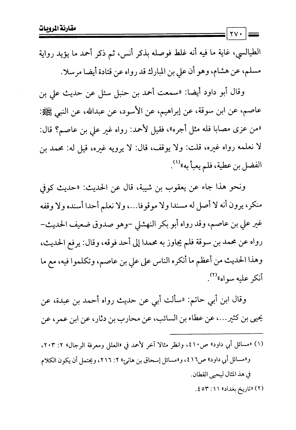 وقال أبو داود أيضا: «سمعت أحمد بن حنبل سئل عن حديث علي بن عاصم، عن ابن سوقة، عن إبراهيم، عن الأسود، عن عبدالله، عن النبي - صلى الله عليه وسلم -: «من عزى مصابا فله مثل أجره»، فقيل لأحمد: رواه غير علي بن عاصم؟ قال: لا نعلمه رواه غيره، قلت: ولا يوقف، قال: لا يرويه غيره، قيل له: محمد بن الفضل بن عطية، فلم يعبأ به» (¬١).