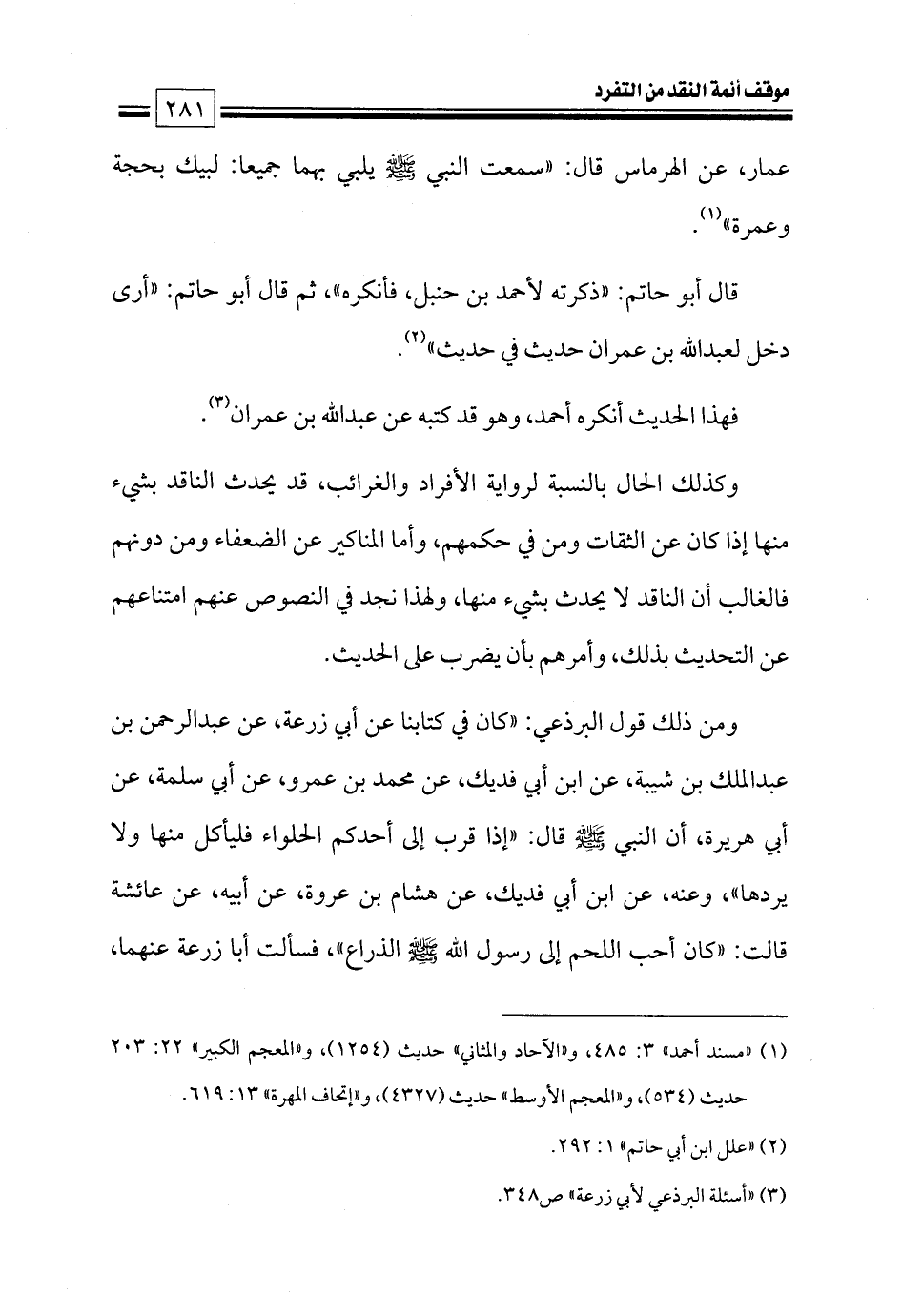 ومن ذلك قول البرذعي: «كان في كتابنا عن أبي زرعة، عن عبدالرحمن بن عبدالملك بن شيبة، عن ابن أبي فديك، عن محمد بن عمرو، عن أبي سلمة، عن أبي هريرة، أن النبي - صلى الله عليه وسلم - قال: «إذا قرب إلى أحدكم الحلواء فليأكل منها ولا يردها»، وعنه، عن ابن أبي فديك، عن هشام بن عروة، عن أبيه، عن عائشة قالت: «كان أحب اللحم إلى رسول الله - صلى الله عليه وسلم - الذراع»، فسألت أبا زرعة عنهما،