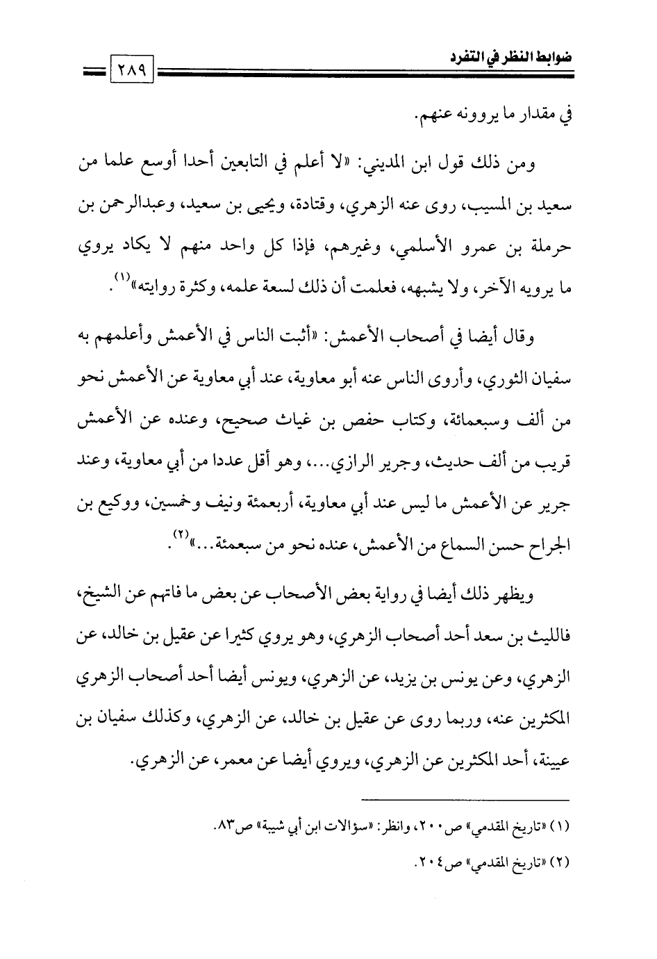 ومن ذلك قول ابن المديني: «لا أعلم في التابعين أحدا أوسع علما من سعيد بن المسيب، روى عنه الزهري، وقتادة، ويحيى بن سعيد، وعبدالرحمن بن حرملة بن عمرو الأسلمي، وغيرهم، فإذا كل واحد منهم لا يكاد يروي ما يرويه الآخر، ولا يشبهه، فعلمت أن ذلك لسعة علمه، وكثرة روايته» (¬١).