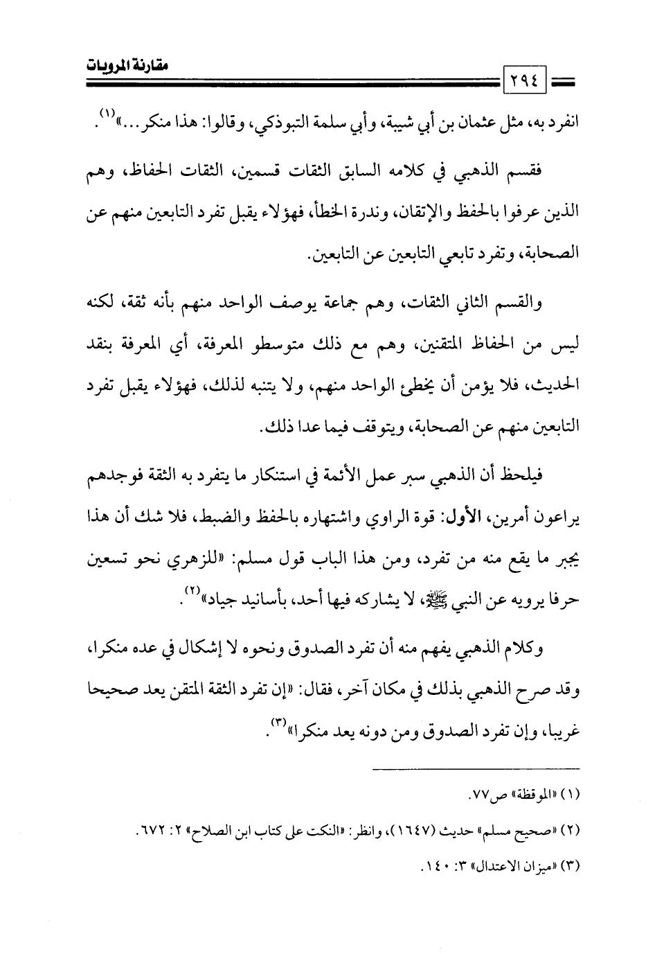 فقسم الذهبي في كلامه السابق الثقات قسمين، الثقات الحفاظ، وهم الذين عرفوا بالحفظ والإتقان، وندرة الخطأ، فهؤلاء يقبل تفرد التابعين منهم عن الصحابة، وتفرد تابعي التابعين عن التابعين.