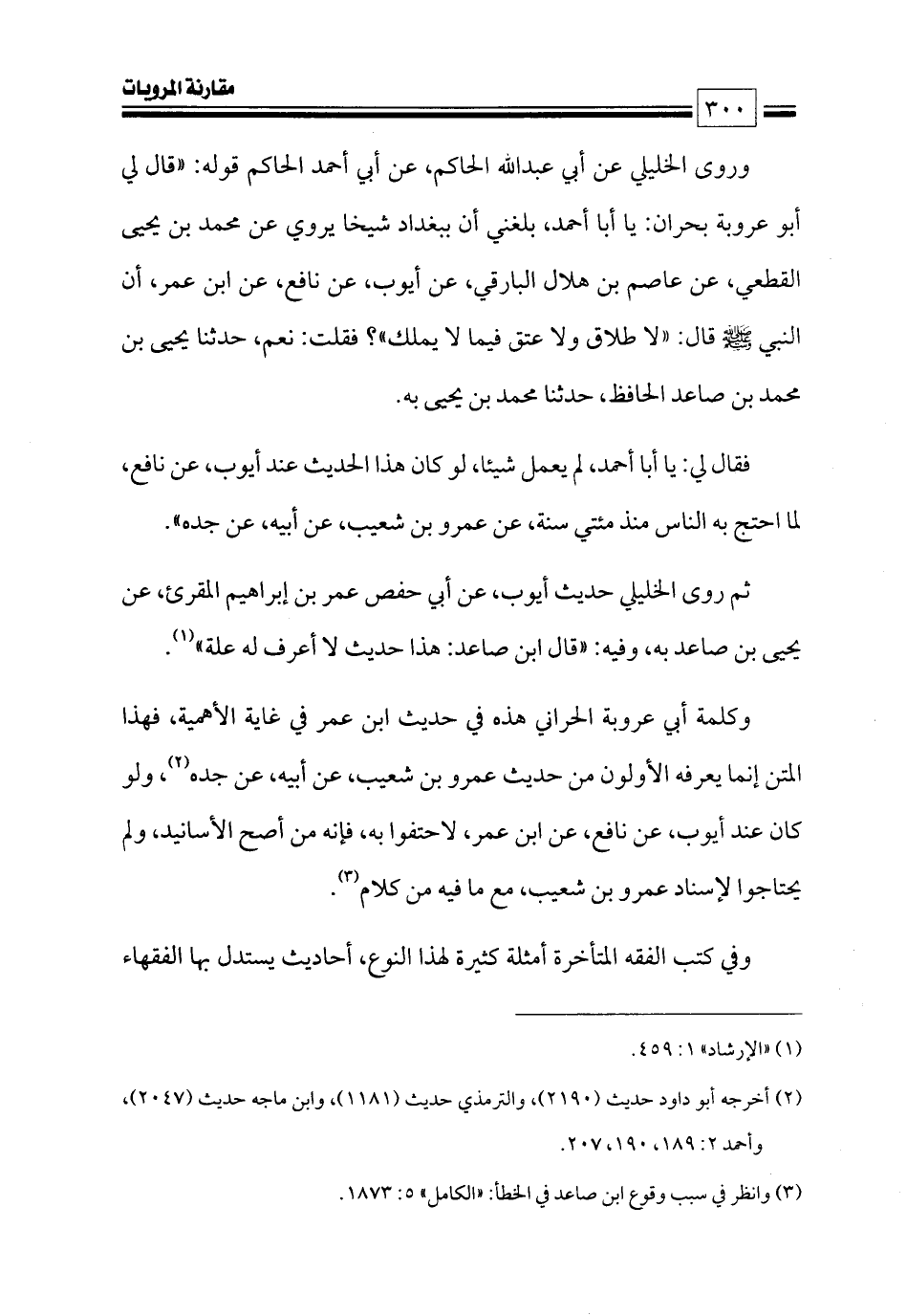 وكلمة أبي عروبة الحراني هذه في حديث ابن عمر في غاية الأهمية، فهذا المتن إنما يعرفه الأولون من حديث عمرو بن شعيب، عن أبيه، عن جده (¬٢)، ولو كان عند أيوب، عن نافع، عن ابن عمر، لاحتفوا به، فإنه من أصح الأسانيد، ولم يحتاجوا لإسناد عمرو بن شعيب، مع ما فيه من كلام (¬٣).