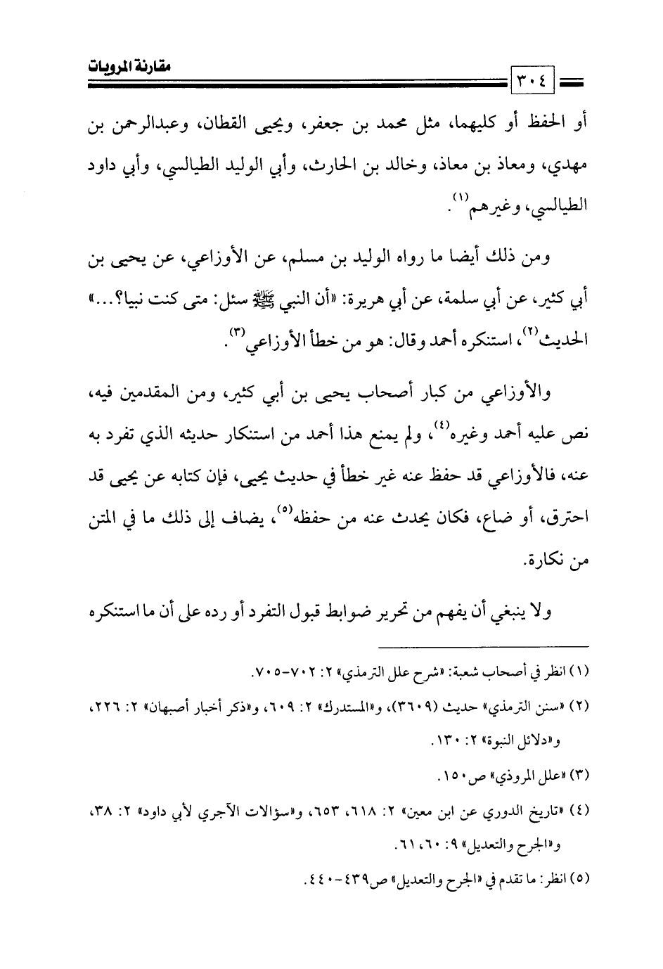 ومن ذلك أيضا ما رواه الوليد بن مسلم، عن الأوزاعي، عن يحيى بن أبي كثير، عن أبي سلمة، عن أبي هريرة: «أن النبي - صلى الله عليه وسلم - سئل: متى كنت نبيا؟ ... » الحديث (¬٢)، استنكره أحمد وقال: هو من خطأ الأوزاعي (¬٣).