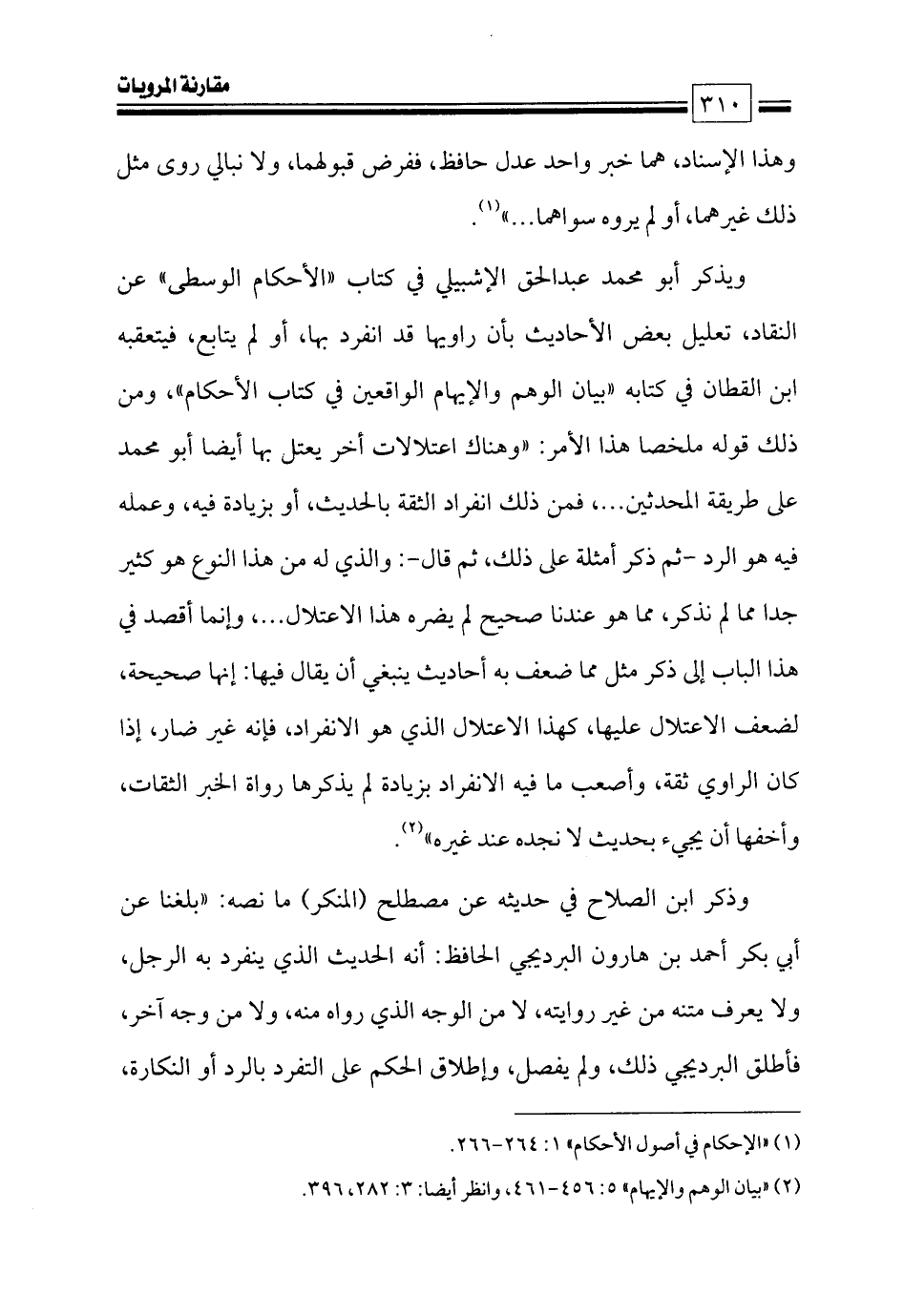 ويذكر أبو محمد عبدالحق الإشبيلي في كتاب «الأحكام الوسطى» عن النقاد، تعليل بعض الأحاديث بأن راويها قد انفرد بها، أو لم يتابع، فيتعقبه ابن القطان في كتابه «بيان الوهم والإيهام الواقعين في كتاب الأحكام»، ومن ذلك قوله ملخصا هذا الأمر: «وهناك اعتلالات أخر يعتل بها أيضا أبو محمد على طريقة المحدثين ... ، فمن ذلك انفراد الثقة بالحديث، أو بزيادة فيه، وعمله فيه هو الرد -ثم ذكر أمثلة على ذلك، ثم قال-: والذي له من هذا النوع هو كثير جدا مما لم نذكر، مما هو عندنا صحيح لم يضره هذا الاعتلال ... ، وإنما أقصد في هذا الباب إلى ذكر مثل مما ضعف به أحاديث ينبغي أن يقال فيها: إنها صحيحة، لضعف الاعتلال عليها، كهذا الاعتلال الذي هو الانفراد، فإنه غير ضار، إذا كان الراوي ثقة، وأصعب ما فيه الانفراد بزيادة لم يذكرها رواة الخبر الثقات، وأخفها أن يجيء بحديث لا نجده عند غيره» (¬٢).