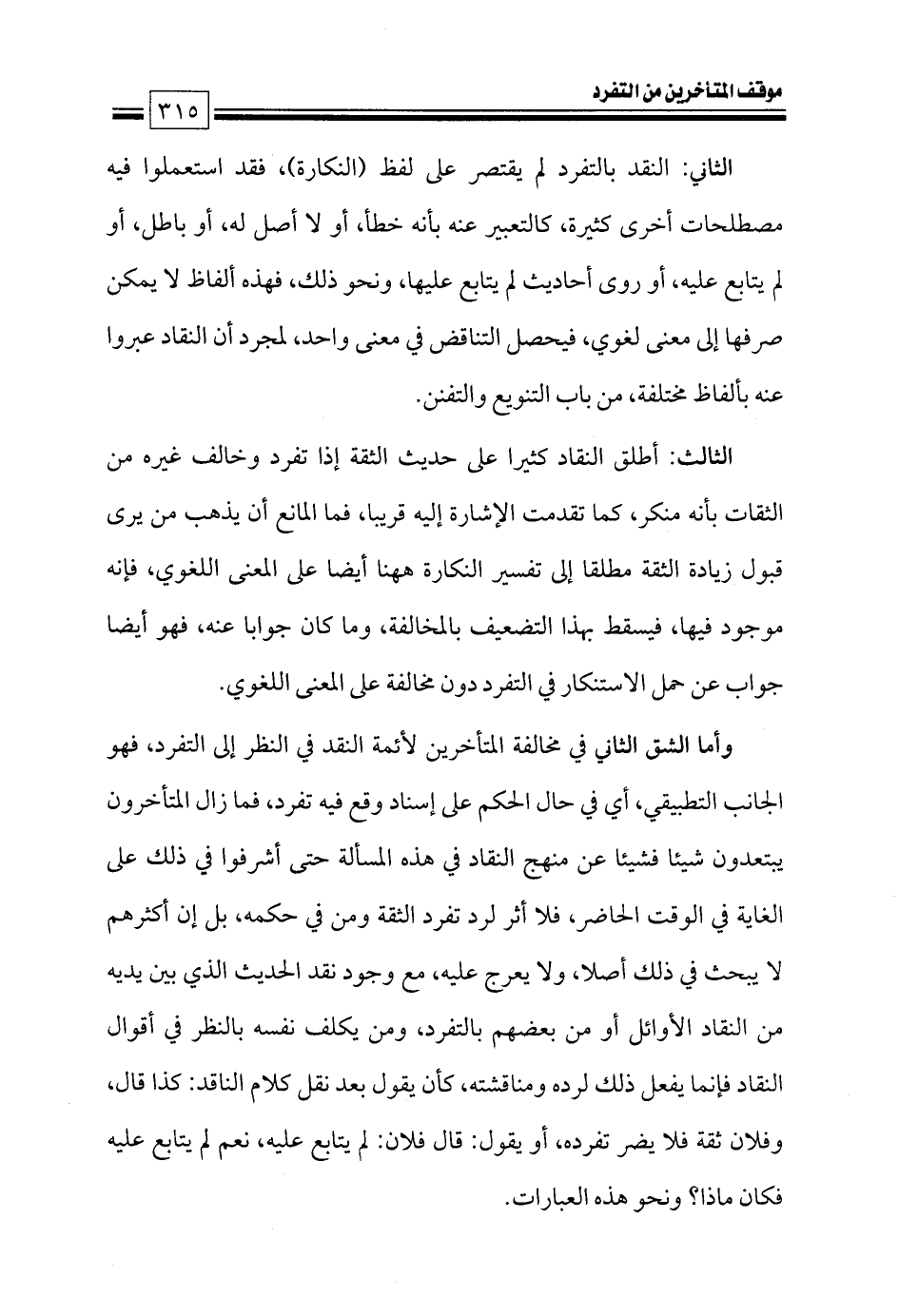 الثاني: النقد بالتفرد لم يقتصر على لفظ (النكارة)، فقد استعملوا فيه مصطلحات أخرى كثيرة، كالتعبير عنه بأنه خطأ، أو لا أصل له، أو باطل، أو لم يتابع عليه، أو روى أحاديث لم يتابع عليها، ونحو ذلك، فهذه ألفاظ لا يمكن صرفها إلى معنى لغوي، فيحصل التناقض في معنى واحد، لمجرد أن النقاد عبروا عنه بألفاظ مختلفة، من باب التنويع والتفنن.