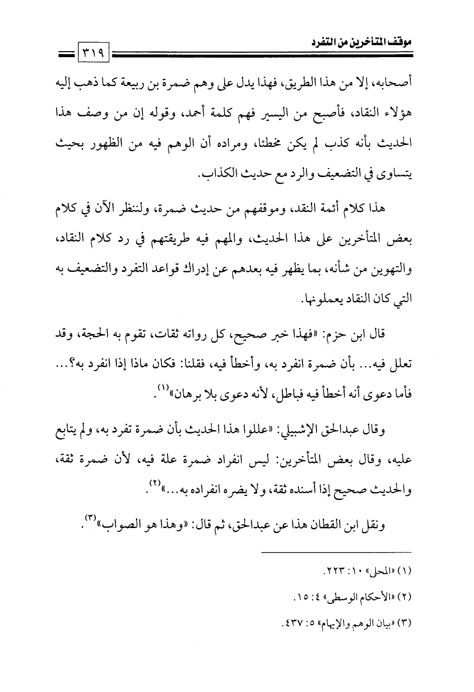 وقال عبدالحق الإشبيلي: «عللوا هذا الحديث بأن ضمرة تفرد به، ولم يتابع عليه، وقال بعض المتأخرين: ليس انفراد ضمرة علة فيه، لأن ضمرة ثقة، والحديث صحيح إذا أسنده ثقة، ولا يضره انفراده به ... » (¬٢).