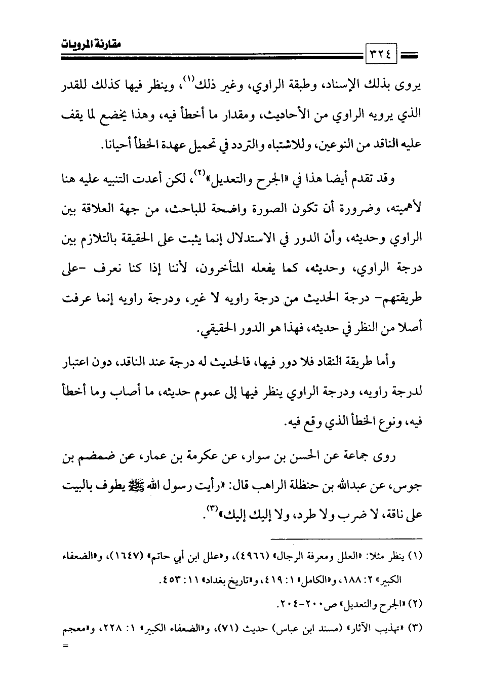 وقد تقدم أيضا هذا في «الجرح والتعديل» (¬٢)، لكن أعدت التنبيه عليه هنا لأهميته، وضرورة أن تكون الصورة واضحة للباحث، من جهة العلاقة بين الراوي وحديثه، وأن الدور في الاستدلال إنما يثبت على الحقيقة بالتلازم بين درجة الراوي، وحديثه، كما يفعله المتأخرون، لأننا إذا كنا نعرف -على طريقتهم- درجة الحديث من درجة راويه لا غير، ودرجة راويه إنما عرفت أصلا من النظر في حديثه، فهذا هو الدور الحقيقي.
