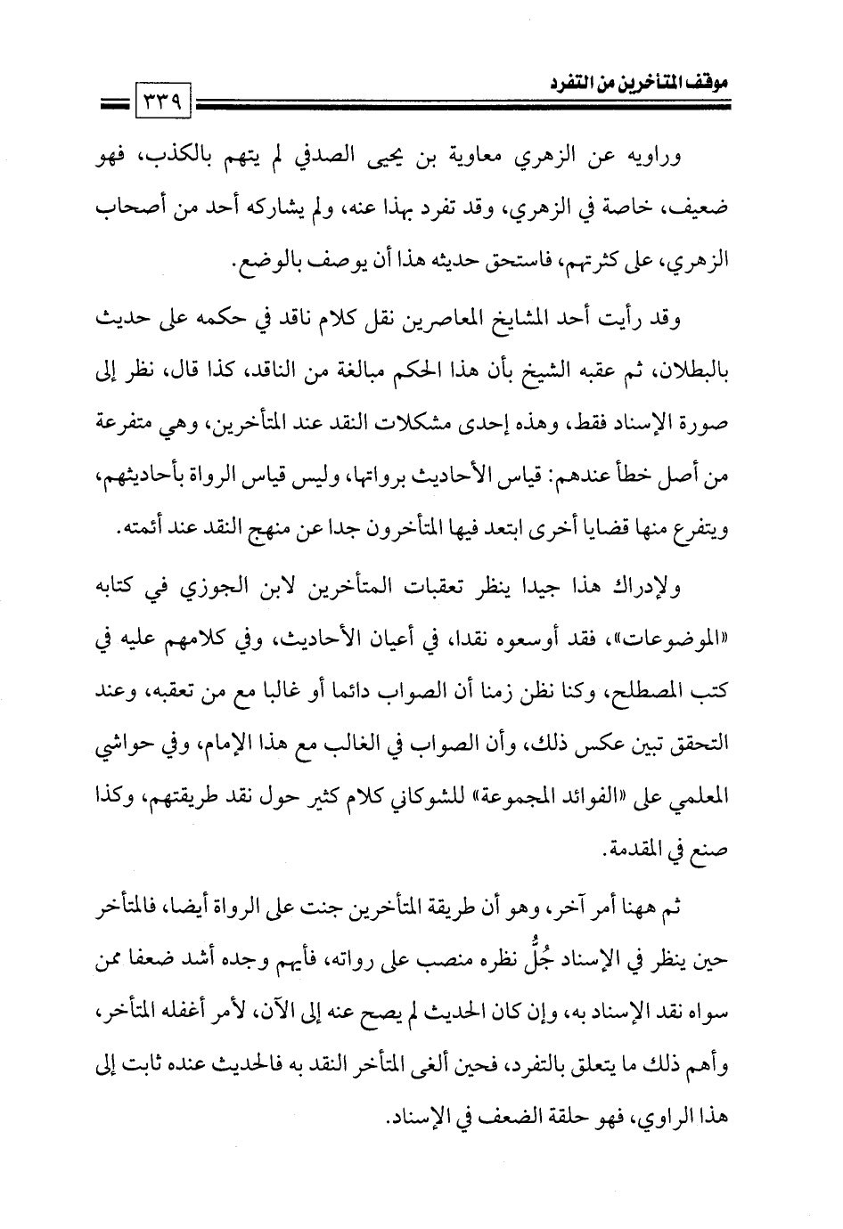 ولإدراك هذا جيدا ينظر تعقبات المتأخرين لابن الجوزي في كتابه «الموضوعات»، فقد أوسعوه نقدا، في أعيان الأحاديث، وفي كلامهم عليه في كتب المصطلح، وكنا نظن زمنا أن الصواب دائما أو غالبا مع من تعقبه، وعند التحقق تبين عكس ذلك، وأن الصواب في الغالب مع هذا الإمام، وفي حواشي المعلمي على «الفوائد المجموعة» للشوكاني كلام كثير حول نقد طريقتهم، وكذا صنع في المقدمة.