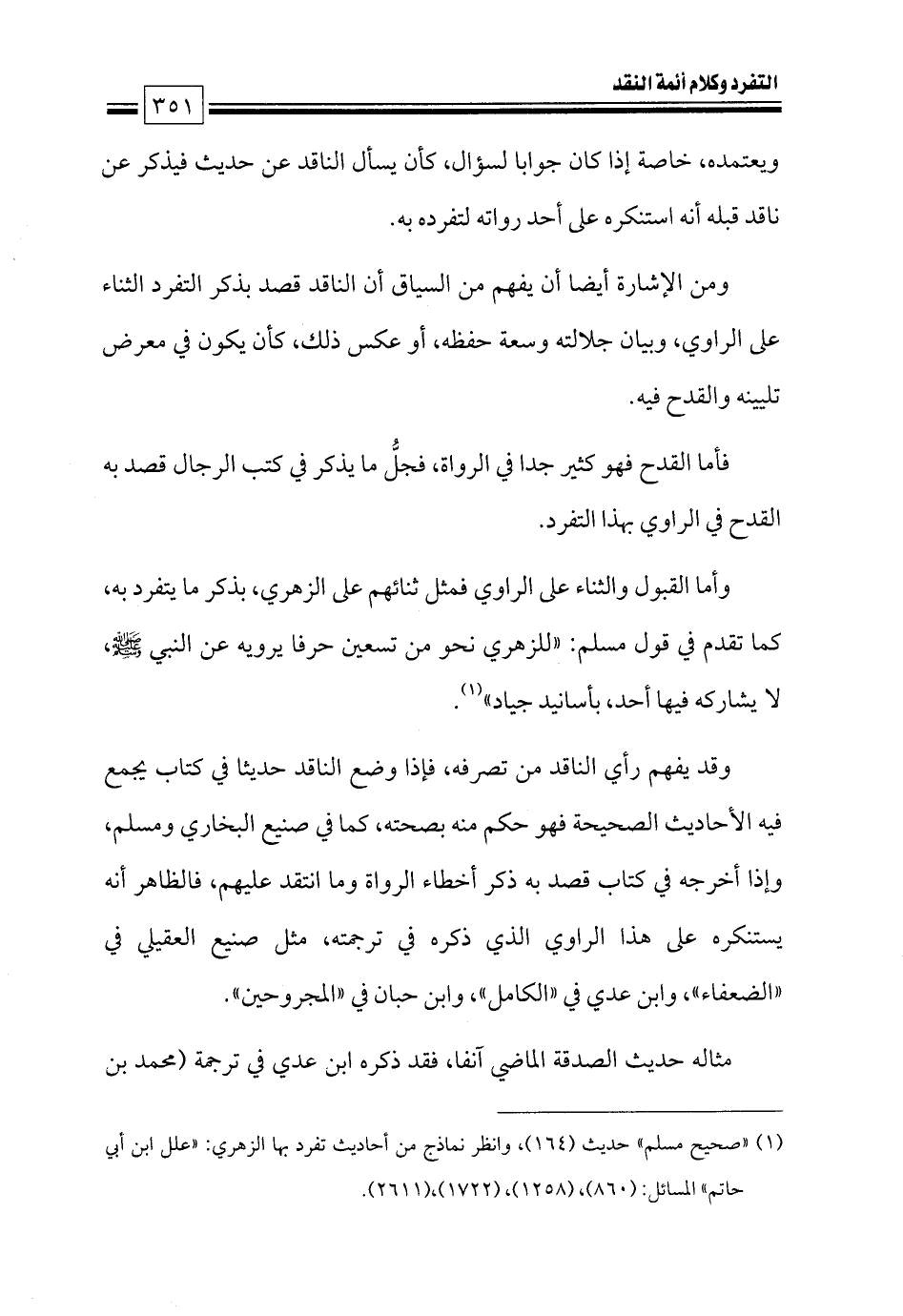 وأما القبول والثناء على الراوي فمثل ثنائهم على الزهري، بذكر ما يتفرد به، كما تقدم في قول مسلم: «للزهري نحو من تسعين حرفا يرويه عن النبي - صلى الله عليه وسلم -، لا يشاركه فيها أحد، بأسانيد جياد» (¬١).