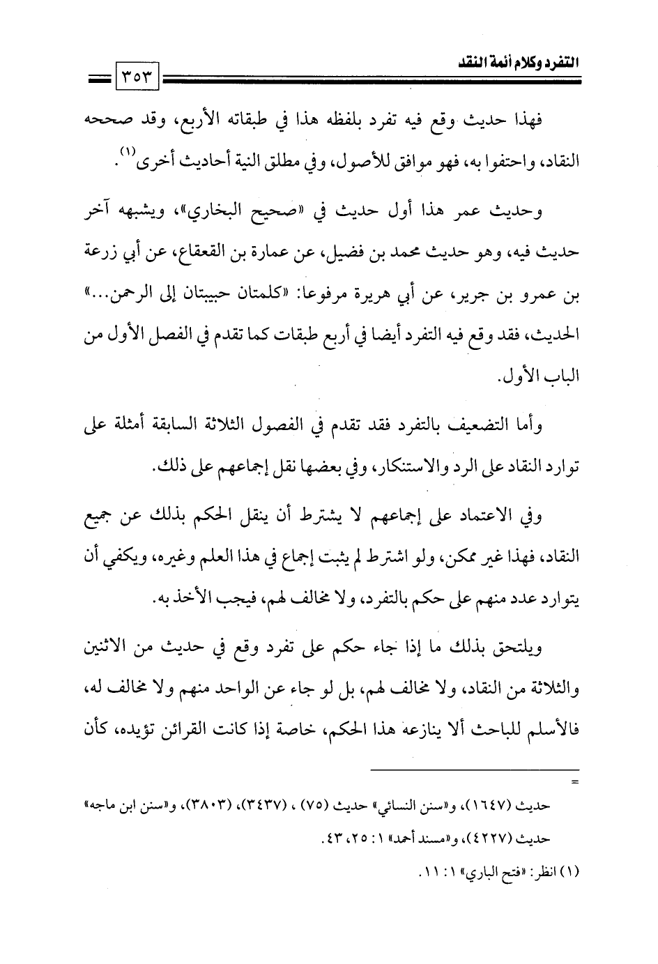 وفي الاعتماد على إجماعهم لا يشترط أن ينقل الحكم بذلك عن جميع النقاد، فهذا غير ممكن، ولو اشترط لم يثبت إجماع في هذا العلم وغيره، ويكفي أن يتوارد عدد منهم على حكم بالتفرد، ولا مخالف لهم، فيجب الأخذ به.