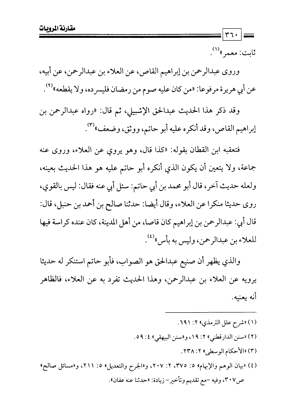 فتعقبه ابن القطان بقوله: «كذا قال, وهو يروي عن العلاء، وروى عنه جماعة، ولا يتعين أن يكون الذي أنكره أبو حاتم عليه هو هذا الحديث بعينه، ولعله حديث آخر، قال أبو محمد بن أبي حاتم: سئل أبي عنه فقال: ليس بالقوي، روى حديثا منكرا عن العلاء، وقال أيضا: حدثنا صالح بن أحمد بن حنبل، قال: قال أبي: عبدالرحمن بن إبراهيم كان قاصا، من أهل المدينة، كان عنده كراسة فيها للعلاء بن عبدالرحمن، وليس به بأس» (¬٤).