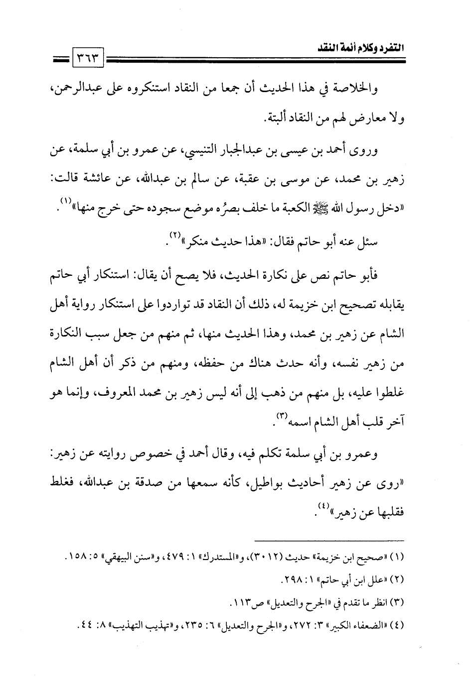 فأبو حاتم نص على نكارة الحديث، فلا يصح أن يقال: استنكار أبي حاتم يقابله تصحيح ابن خزيمة له، ذلك أن النقاد قد تواردوا على استنكار رواية أهل الشام عن زهير بن محمد، وهذا الحديث منها، ثم منهم من جعل سبب النكارة من زهير نفسه، وأنه حدث هناك من حفظه، ومنهم من ذكر أن أهل الشام غلطوا عليه، بل منهم من ذهب إلى أنه ليس زهير بن محمد المعروف، وإنما هو آخر قلب أهل الشام اسمه (¬٣).