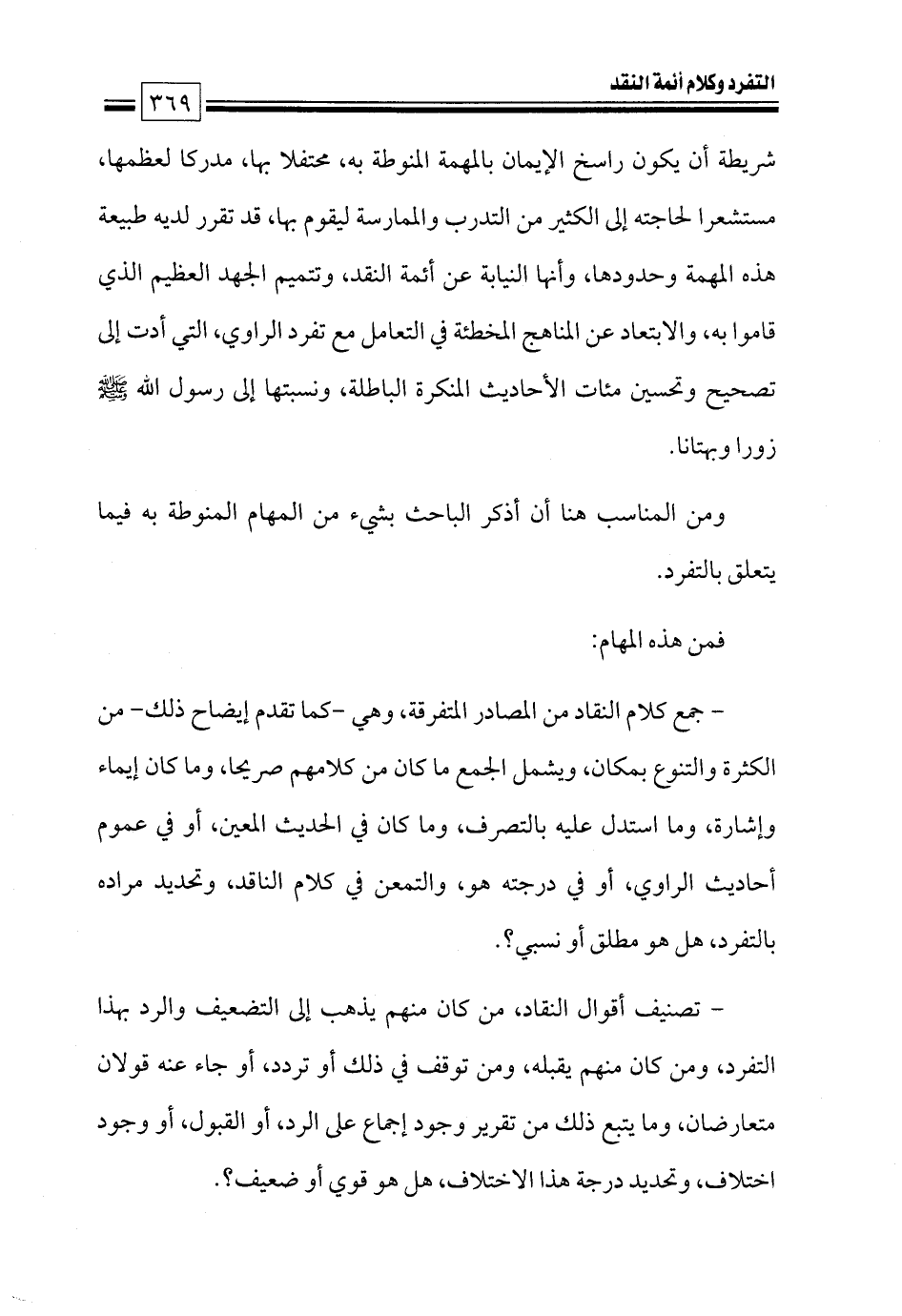 شريطة أن يكون راسخ الإيمان بالمهمة المنوطة به، محتفلا بها، مدركا لعظمها، مستشعرا لحاجته إلى الكثير من التدرب والممارسة ليقوم بها، قد تقرر لديه طبيعة هذه المهمة وحدودها، وأنها النيابة عن أئمة النقد، وتتميم الجهد العظيم الذي قاموا به، والابتعاد عن المناهج المخطئة في التعامل مع تفرد الراوي، التي أدت إلى تصحيح وتحسين مئات الأحاديث المنكرة الباطلة، ونسبتها إلى رسول الله - صلى الله عليه وسلم - زورا وبهتانا.