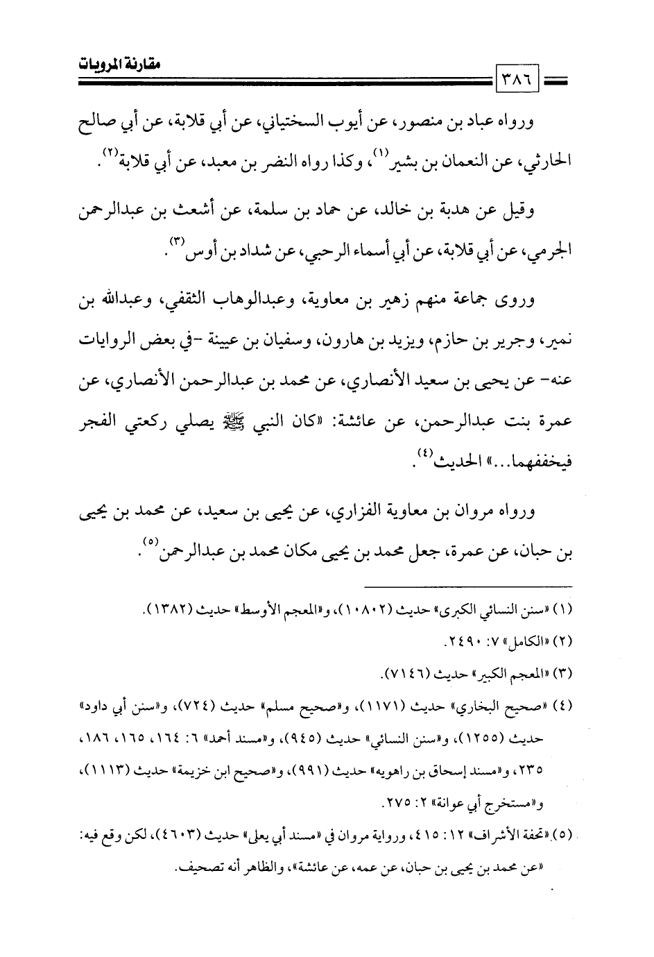 وروى جماعة منهم زهير بن معاوية، وعبدالوهاب الثقفي، وعبدالله بن نمير، وجرير بن حازم، ويزيد بن هارون، وسفيان بن عيينة -في بعض الروايات عنه- عن يحيى بن سعيد الأنصاري، عن محمد بن عبدالرحمن الأنصاري، عن عمرة بنت عبدالرحمن، عن عائشة: «كان النبي - صلى الله عليه وسلم - يصلي ركعتي الفجر فيخففهما ... » الحديث (¬٤).