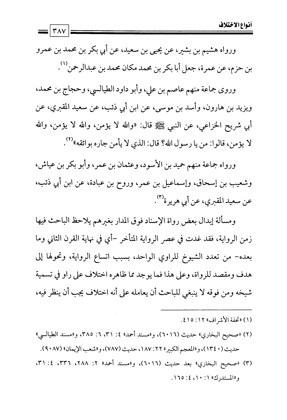 وروى جماعة منهم عاصم بن علي، وأبو داود الطيالسي، وحجاج بن محمد، ويزيد بن هارون، وأسد بن موسى، عن ابن أبي ذئب، عن سعيد المقبري، عن أبي شريح الخزاعي، عن النبي - صلى الله عليه وسلم - قال: «والله لا يؤمن، والله لا يؤمن، والله لا يؤمن، قالوا: من يا رسول الله؟ قال: الذي لا يأمن جاره بوائقه» (¬٢).