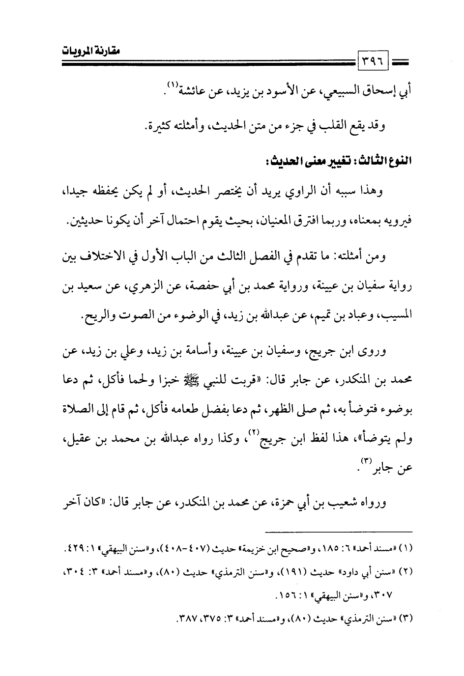 ومن أمثلته: ما تقدم في الفصل الثالث من الباب الأول في الاختلاف بين رواية سفيان بن عيينة، ورواية محمد بن أبي حفصة، عن الزهري، عن سعيد بن المسيب، وعباد بن تميم، عن عبدالله بن زيد، في الوضوء من الصوت والريح.