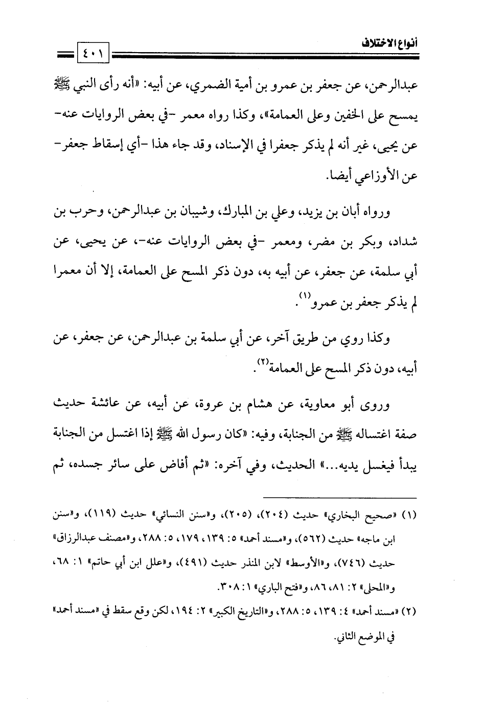 عبدالرحمن، عن جعفر بن عمرو بن أمية الضمري، عن أبيه: «أنه رأى النبي - صلى الله عليه وسلم - يمسح على الخفين وعلى العمامة»، وكذا رواه معمر -في بعض الروايات عنه- عن يحيى، غير أنه لم يذكر جعفرا في الإسناد، وقد جاء هذا -أي إسقاط جعفر- عن الأوزاعي أيضا.