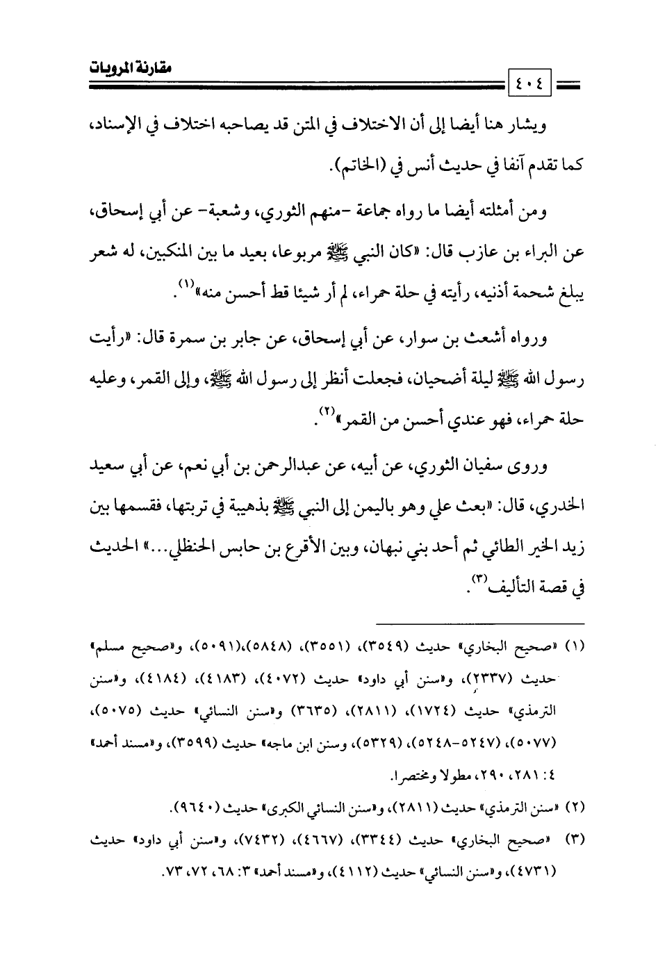 ومن أمثلته أيضا ما رواه جماعة -منهم الثوري، وشعبة- عن أبي إسحاق، عن البراء بن عازب قال: «كان النبي - صلى الله عليه وسلم - مربوعا، بعيد ما بين المنكبين، له شعر يبلغ شحمة أذنيه، رأيته في حلة حمراء، لم أر شيئا قط أحسن منه» (¬١).