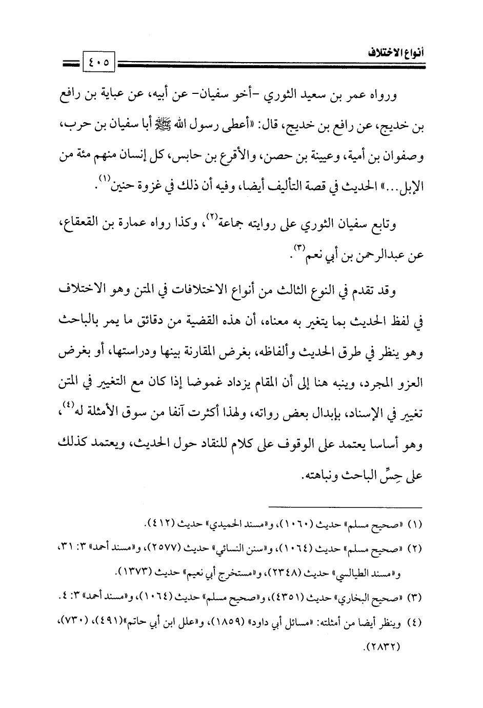 ورواه عمر بن سعيد الثوري -أخو سفيان- عن أبيه، عن عباية بن رافع بن خديج، عن رافع بن خديج، قال: «أعطى رسول الله - صلى الله عليه وسلم - أبا سفيان بن حرب، وصفوان بن أمية، وعيينة بن حصن، والأقرع بن حابس، كل إنسان منهم مئة من الإبل ... » الحديث في قصة التأليف أيضا، وفيه أن ذلك في غزوة حنين (¬١).