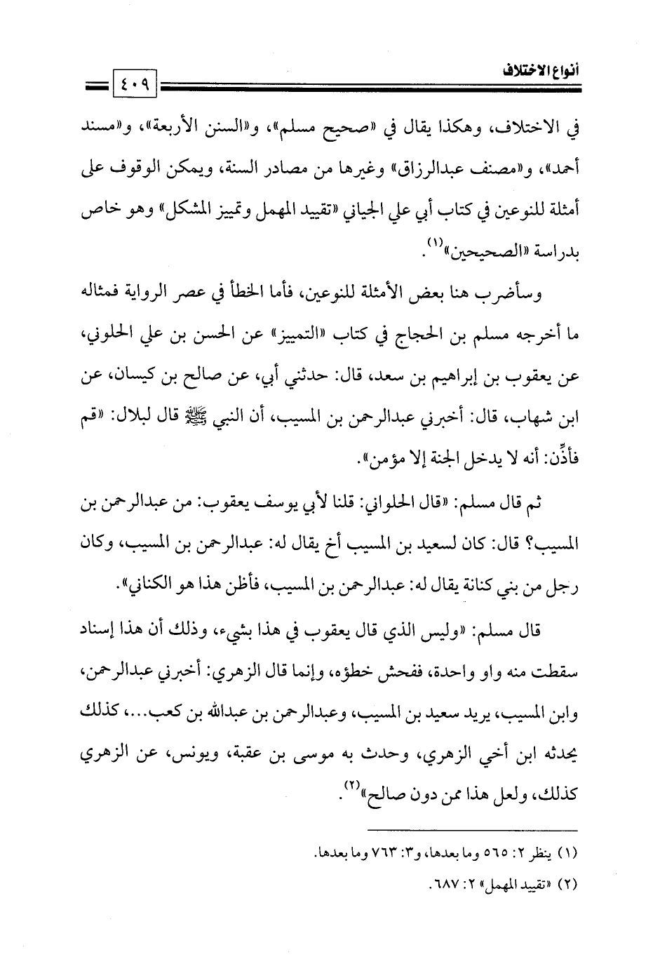في الاختلاف، وهكذا يقال في «صحيح مسلم»، و «السنن الأربعة»، و «مسند أحمد»، و «مصنف عبدالرزاق» وغيرها من مصادر السنة، ويمكن الوقوف على أمثلة للنوعين في كتاب أبي علي الجياني «تقييد المهمل وتمييز المشكل» وهو خاص بدراسة «الصحيحين» (¬١).